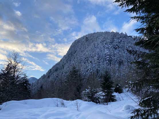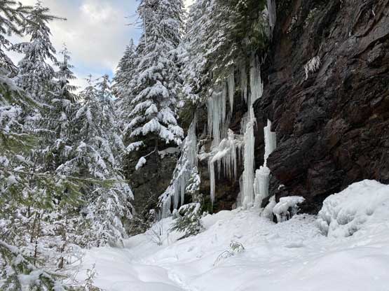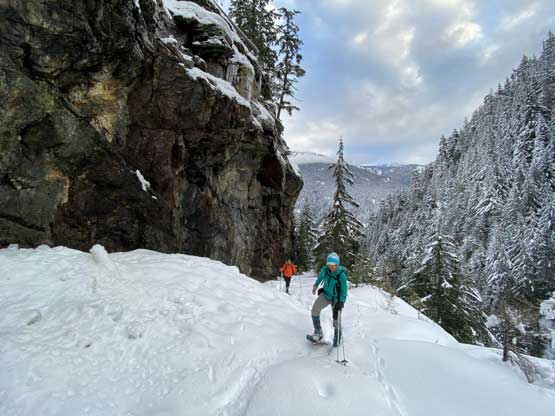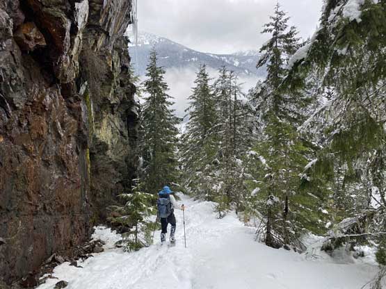 The morning was cold so we spent as little time as possible to do the trail-head transition. We then hopped over the gate and walked to the end of pavement while carrying snowshoes on our hands. We instantly located Al and Katie’s tracks, strapped the snowshoes on and into the woods we went. The tracks were covered by at least 10 cm of fresh snow even at the parking lot elevation (750 m) and we wondered how bad the condition would be up high at 2000 m… The start of the very deactivated Ferguson Creek Road was confusing judging by the meandering tracks made by Al and Katie. They simply didn’t manage to find the road’s entrance and started bushwhacking right off the bat. We followed the tracks and entered the bush as well, but a while later we did join the old road. The road was still in a walkable shape and the next 300 horizontal meters was a cruise sailing. We snowshoed passed some overhanging cliffs following the partially covered, but still visible set of snowshoe tracks as well as the GPS track given by Al.