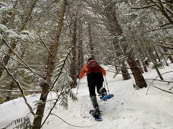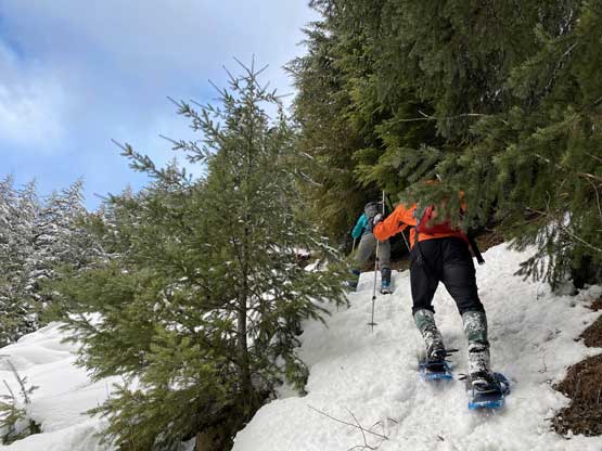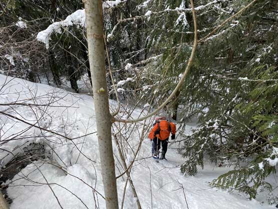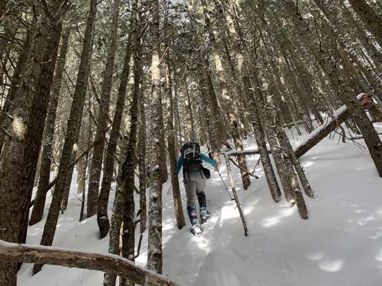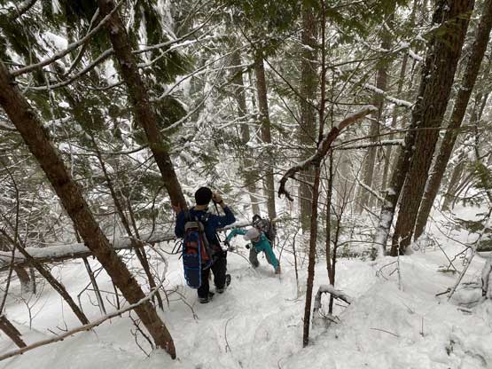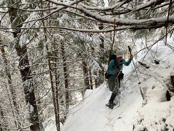 It seemed like Al and Katie opted to bail the road into the forest at the exact same spot as Simon’s trip report suggested. We followed the tracks up the edge of a landslide path, and then traversed some steep dirt (with snowshoes on) to get into the forest. The going became a steep grunt in absolutely no time, as we found ourselves trudging up the 40-45 degree forest with some light bushwhacking and a lot of annoying side-hill traversing. I invented the term “technical snowshoeing” for this type of terrain. The snow was too soft for boot-packing, but to keep snowshoes on one needs the best gears along with years of experience. My Lightning Ascents could tackle firm, 40-degree slope with the right techniques. I thought the worst would come to an end soon but I was wrong. The same type of terrain lasted for more than 500 vertical meters, until at around 1300-1400 m where the grade finally eased off to 30 degrees ish (yes, it’s still steep)… The challenge gradually shifted from the steepness to the increasing duty of trail-breaking. At this elevation there was at least 20 cm of fresh snow and we had to break trail on top of Al’s tracks, and the going was tough.