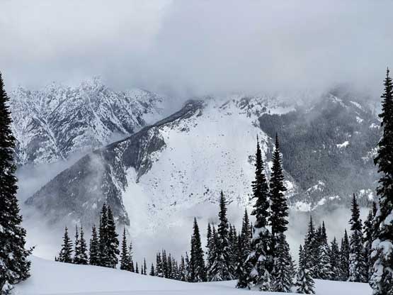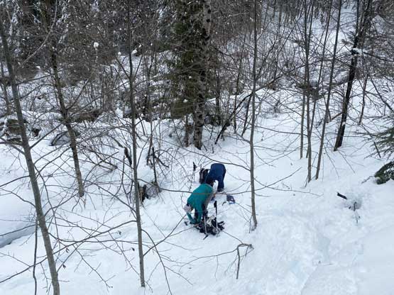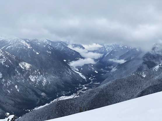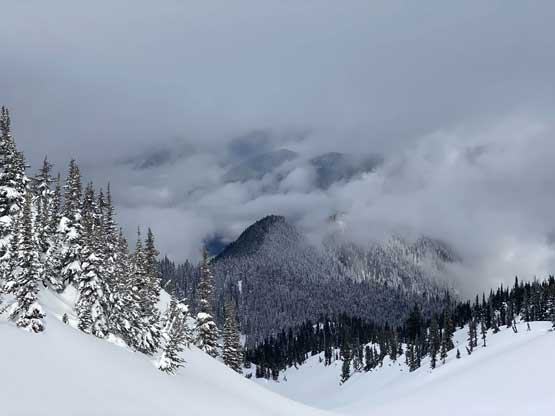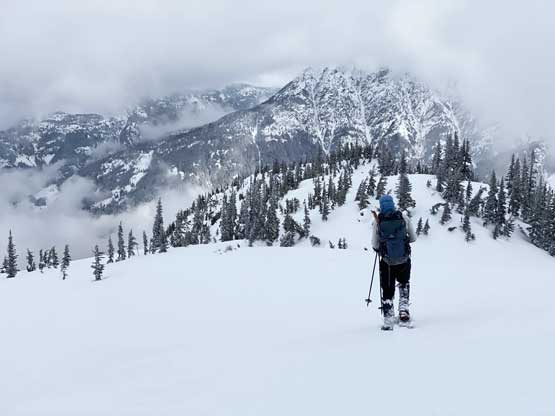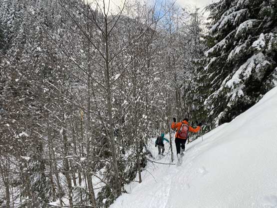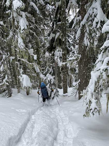 We reasoned that the chance of clearing is zero so didn’t even bother to drop our backpacks. We immediately, but carefully down-climbed the ridge and then took a long break at our snowshoes. The snowshoes were strapped on and we had a trouble-free descent back across the false summits and then down into the woods. The snowshoeing was fun with the foot-deep powder, but not so much anymore once the powder ran out and the grade picked up. We kept our snowshoes on and practised that “technical snowshoeing” all the way down to within 500 vertical meters from the road. We then removed the snowshoes and post-holed and slipped like being drunk. It appeared that Al and Katie went for some glissading but such was impossible for us because the snow stayed frozen solid the whole day. Their glissade tracks were particularly icy, that we actually had to avoid them. The snow was however, not entirely supportive for boot-packing and we often discovered holes up to our waist. Needless to say it was such a shit show, but we were all experienced in this type of shit, so still managed to descend in a timely manner. Once dropping down to the road we strapped the ‘shoes on and easily reversed our tracks back to the truck. It also appeared that Al and Katie went down a different route near the end, maybe to find where actually that Ferguson Creek FSR started. However, at this point we just said “fuck it” and retraced our own snowshoe tracks for simplicity and less mental work.