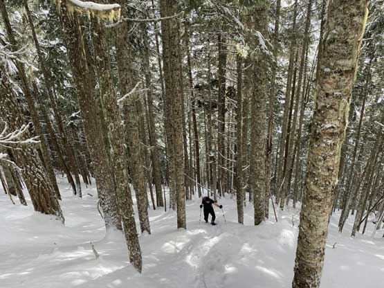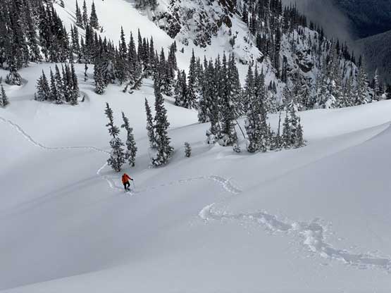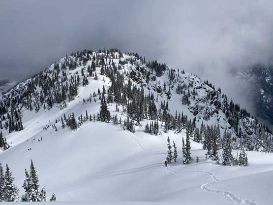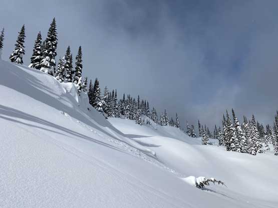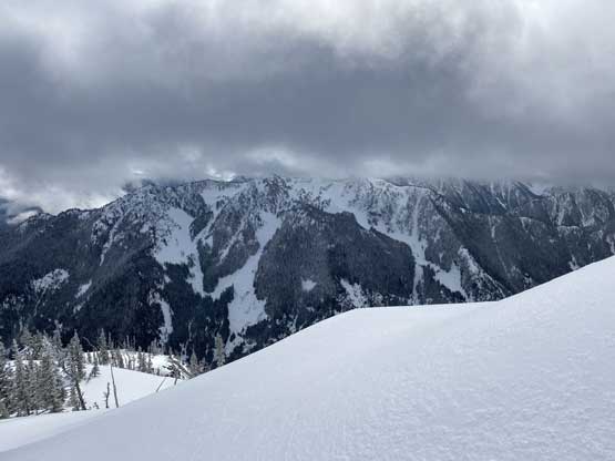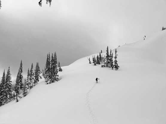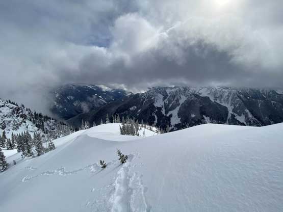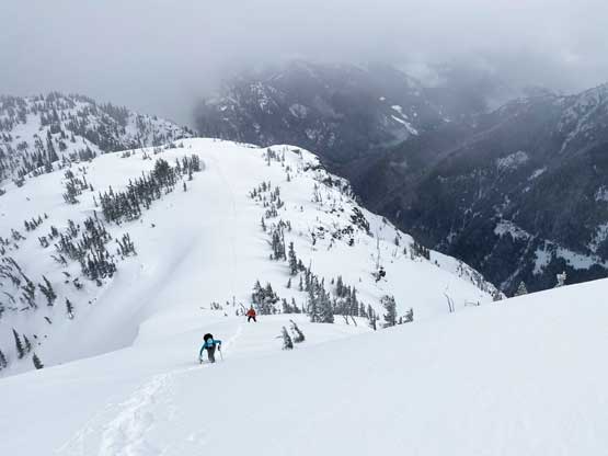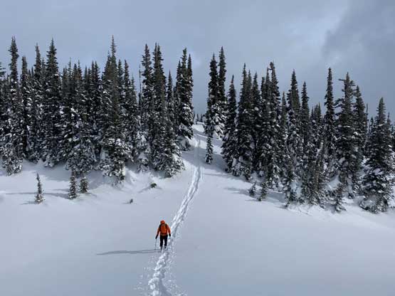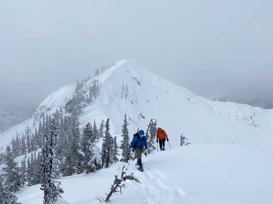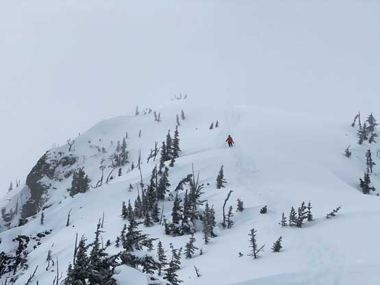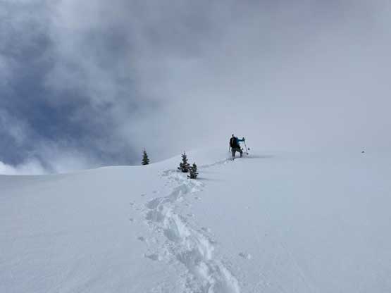 Another hour later we were in the treeline zone, breaking trail in heavy powder with no sign of Al’s tracks anymore. The weather was garbage compared to what the forecast promised. It was 100% overcast with intermittent white-outs. To reach the first of the several false summit we traversed across an undulating sections and then ascended the first steep slope, 35 degrees or more. Mel had a lot of energy and led us all the way through this treeline zone past the first false summit and down to the next saddle. The descent involved at least 30 m of annoying elevation loss. The next summit appeared dauntingly steep and exposed with cliffs on both sides. It turned out not as bad as appeared but still, more than 35 degrees and an avalanche on that final slope could have big consequences. Thankfully we only found wind slabs on the lower half of the grunt.