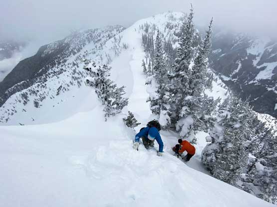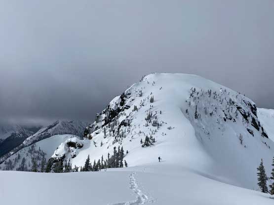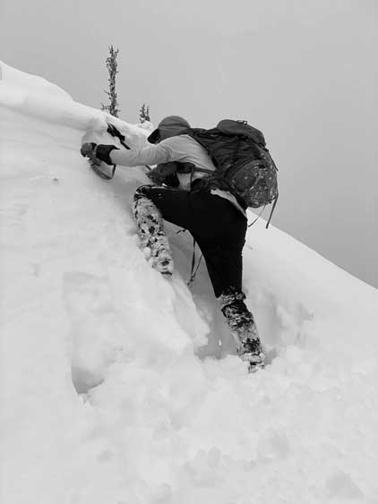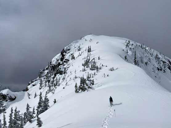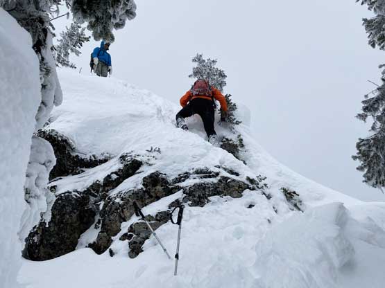 The next highpoint would be the true summit and the ascent wasn’t easy neither. First we had to lose another 20 m down to the saddle and the going soon became interesting. The ridge narrowed down with steep trees on climber’s left and massive cornices on climber’s right. It wasn’t very obvious to see the edge of these cornices so we opted to weave around in the trees. From the saddle onward I led the first steep step while keeping the snowshoes on, and then made the call to ditch the ‘shoes to swap for ice axe. The second step involved some trenching and hauling and then I veered slightly climber’s left to access that “vertical step” mentioned by Al. The crux step was surely steep, but I could grab some veges and the ice axe planted in nicely. Above the step we had one short, but 45 degree snow slope to ascend and then we topped out on the summit, with very limited views thank to the clouds.