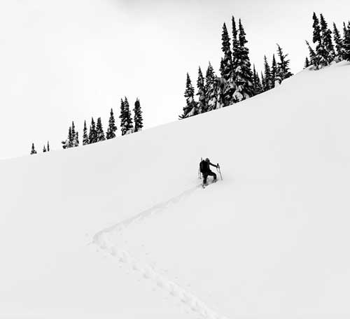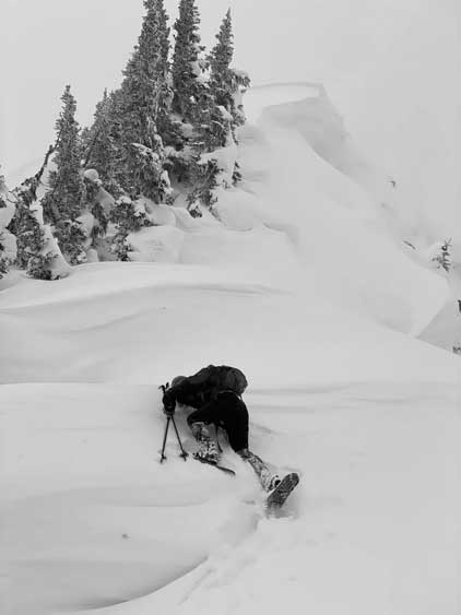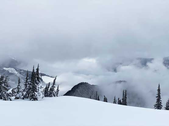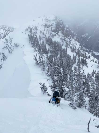 Another hour later we were in the treeline zone, breaking trail in heavy powder with no sign of Al’s tracks anymore. The weather was garbage compared to what the forecast promised. It was 100% overcast with intermittent white-outs. To reach the first of the several false summit we traversed across an undulating sections and then ascended the first steep slope, 35 degrees or more. Mel had a lot of energy and led us all the way through this treeline zone past the first false summit and down to the next saddle. The descent involved at least 30 m of annoying elevation loss. The next summit appeared dauntingly steep and exposed with cliffs on both sides. It turned out not as bad as appeared but still, more than 35 degrees and an avalanche on that final slope could have big consequences. Thankfully we only found wind slabs on the lower half of the grunt.