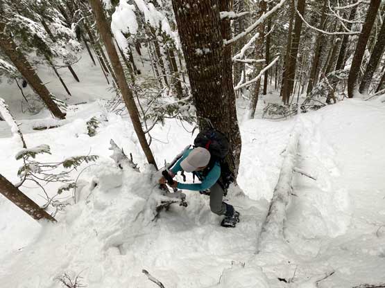 It seemed like Al and Katie opted to bail the road into the forest at the exact same spot as Simon’s trip report suggested. We followed the tracks up the edge of a landslide path, and then traversed some steep dirt (with snowshoes on) to get into the forest. The going became a steep grunt in absolutely no time, as we found ourselves trudging up the 40-45 degree forest with some light bushwhacking and a lot of annoying side-hill traversing. I invented the term “technical snowshoeing” for this type of terrain. The snow was too soft for boot-packing, but to keep snowshoes on one needs the best gears along with years of experience. My Lightning Ascents could tackle firm, 40-degree slope with the right techniques. I thought the worst would come to an end soon but I was wrong. The same type of terrain lasted for more than 500 vertical meters, until at around 1300-1400 m where the grade finally eased off to 30 degrees ish (yes, it’s still steep)… The challenge gradually shifted from the steepness to the increasing duty of trail-breaking. At this elevation there was at least 20 cm of fresh snow and we had to break trail on top of Al’s tracks, and the going was tough.