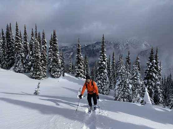 We reasoned that the chance of clearing is zero so didn’t even bother to drop our backpacks. We immediately, but carefully down-climbed the ridge and then took a long break at our snowshoes. The snowshoes were strapped on and we had a trouble-free descent back across the false summits and then down into the woods. The snowshoeing was fun with the foot-deep powder, but not so much anymore once the powder ran out and the grade picked up. We kept our snowshoes on and practised that “technical snowshoeing” all the way down to within 500 vertical meters from the road. We then removed the snowshoes and post-holed and slipped like being drunk. It appeared that Al and Katie went for some glissading but such was impossible for us because the snow stayed frozen solid the whole day. Their glissade tracks were particularly icy, that we actually had to avoid them. The snow was however, not entirely supportive for boot-packing and we often discovered holes up to our waist. Needless to say it was such a shit show, but we were all experienced in this type of shit, so still managed to descend in a timely manner. Once dropping down to the road we strapped the ‘shoes on and easily reversed our tracks back to the truck. It also appeared that Al and Katie went down a different route near the end, maybe to find where actually that Ferguson Creek FSR started. However, at this point we just said “fuck it” and retraced our own snowshoe tracks for simplicity and less mental work.