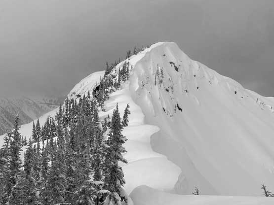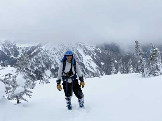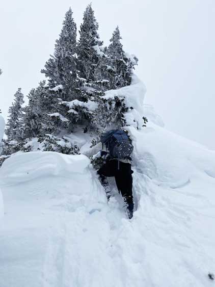 The next highpoint would be the true summit and the ascent wasn’t easy neither. First we had to lose another 20 m down to the saddle and the going soon became interesting. The ridge narrowed down with steep trees on climber’s left and massive cornices on climber’s right. It wasn’t very obvious to see the edge of these cornices so we opted to weave around in the trees. From the saddle onward I led the first steep step while keeping the snowshoes on, and then made the call to ditch the ‘shoes to swap for ice axe. The second step involved some trenching and hauling and then I veered slightly climber’s left to access that “vertical step” mentioned by Al. The crux step was surely steep, but I could grab some veges and the ice axe planted in nicely. Above the step we had one short, but 45 degree snow slope to ascend and then we topped out on the summit, with very limited views thank to the clouds.