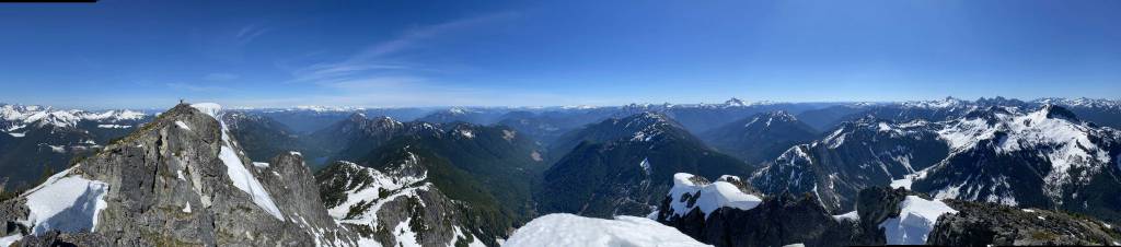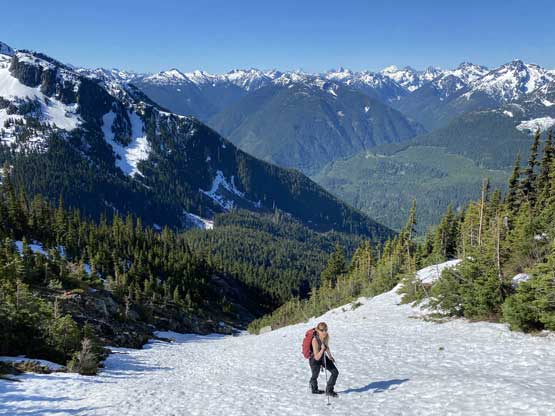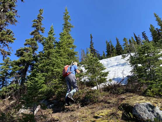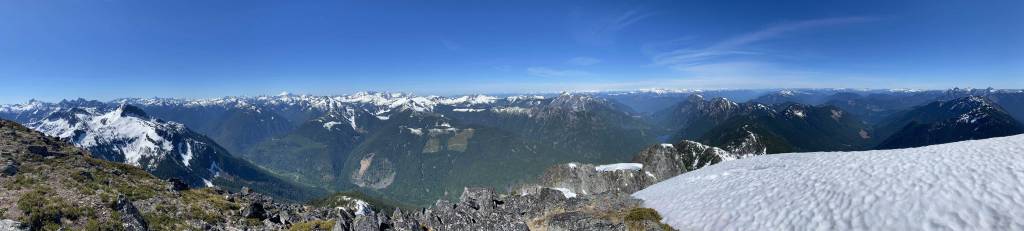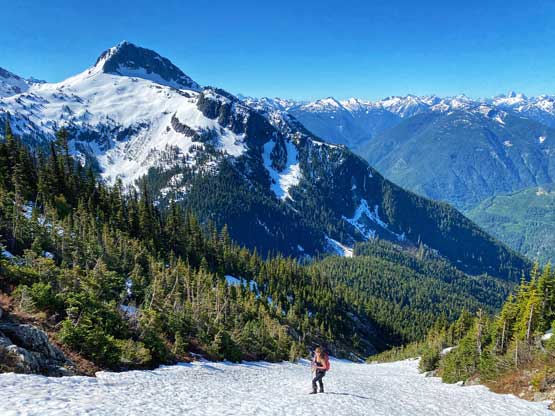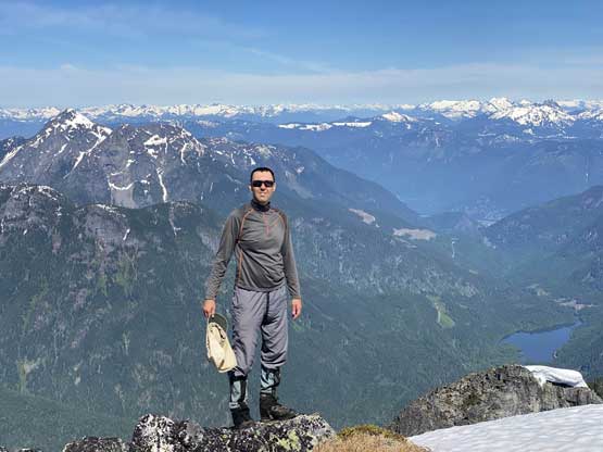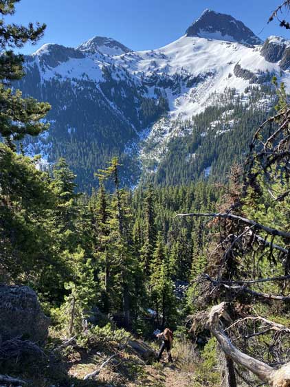 We lingered for almost an hour on the summit because it’s a cool place to stay. I had done the nearby Wells Peak, Hope Mountain and Mt. Coulter but did not get much of a view from any of them, so it’s nice to see what’s actually in this area. On the descent we used a combination of plunging, boot-skiing and glissading to get off the upper snowfield. The glissading was a bit too fast for our likes and to stop the slide I pretty much had to dive into the proper self-arresting mode using an ice axe. While transitioning gears we met Sergio coming up alone and he sure recognized us from following on Instagram. The descent from that spot back down to Eaton Lake trail was not difficult but required some mental work as we did have to pay close attention to the terrain. The trail/path wasn’t the easiest to follow due to snow etc. and the bushwhacking section required GPS navigation to stay on route. Once hitting the trail we took the last long break so that I could switch gears back to trail runners and shorts and the rest of the hike-out was uneventful, albeit boring. The quality of this trail sure made the 1700+ m ascent not as tiring as it was supposed to be.