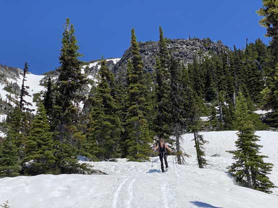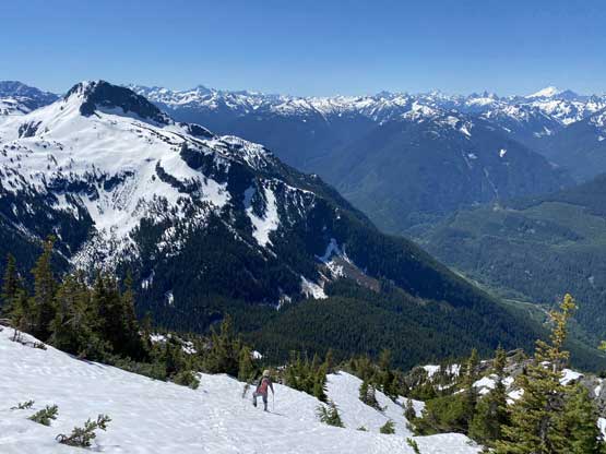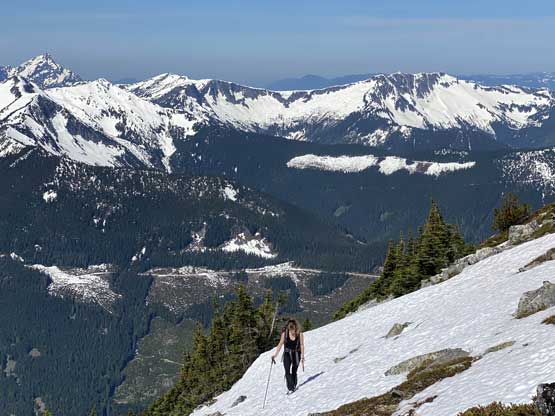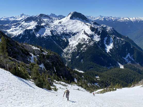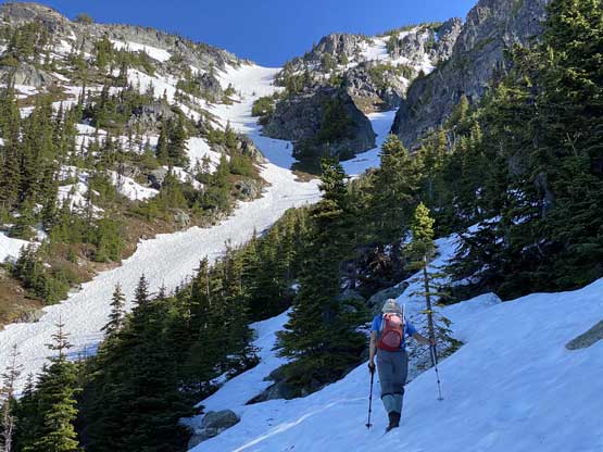 Elise coming up a steep zone with Eaton Peak behind