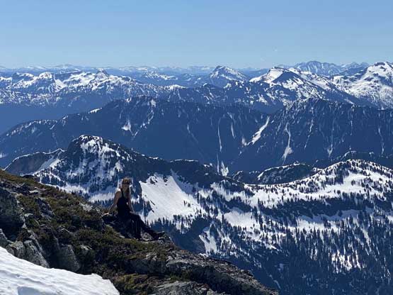 Elise soaking in the sun with the typical Manning Park scenery behind