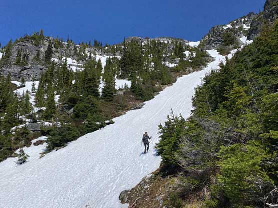 After crossing Eaton Creek back to the north side we took a long break ditching some gears and donning others. The trail continues on the north side for a short while before crossing back to the south side over a “sketchy bridge” according to recent reports on AllTrails. Given that Mt. Grant locates on the north side of Eaton Lake/Creek I would assume one has to cross the outflow on Eaton Lake and given the high water level in “mid spring” I would assume the creek crossing wouldn’t be that straightforward. My plan was to bushwhack directly towards Mt. Grant from the spot where we crossed Eaton Creek to the north side, and skip all the uncertainties associated with the outflow of Eaton Lake and that “sketchy bridge” which apparently required an au-cheval at the moment. The bushwhack involved some minor route-finding through bluffs, boulders and dead-falls but nothing really worth noting. Again, the strategy for us was to have a low expectation so once we actually saw the terrain we thought it was pretty easy. A while later we intersected the flagged path/trail that came up from Eaton Lake and easily followed it over increasingly steep and rough terrain to snowline at around 1500 m elevation. The worst was crossing a boulder field covered in soft snow. We then ascended continuous snow and cut into the major “south face gully” at 1750 m.