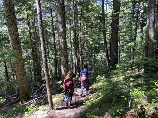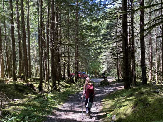 The weather would be sunny but very hot with valley temperature approaching or above 30 degrees in the afternoon so we must aim to summit this peak early. On top of that Vlad did not have a vehicle on this midweek outing, so I set the alarm at 2:50 am. I woke up with less than 2 hours of sleep, drove to Richmond to grab Vlad at 3:30 am then grabbed Elise from Abbotsford an hour later. Buying food from McDonald’s proved to be a little bit problematic due to some mechanical failures but I didn’t buy breakfast beforehand so we must wait. Thankfully the wait wasn’t too long. To make up the time loss I was able to cruise down Silver-Skagit Road at 60+ km/h and we eventually started the hike at 6 am. Parking at the trail-head was a bit concerning due to some homeless camping right next to the parking lot, but I figured that they wouldn’t be stupid enough to break-in the vehicles right from their “front door”.