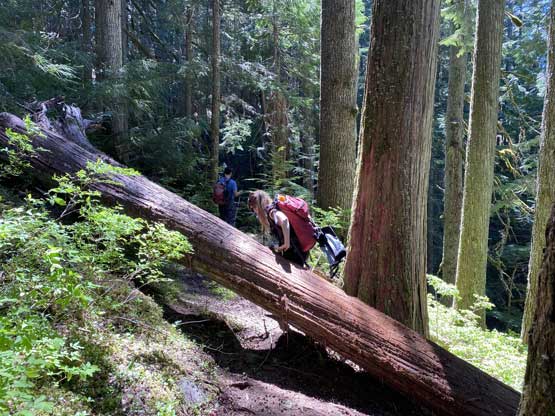I had done my homework studying the terrain and the weather and my decision was to hike this approach in shorts and trail-runners while carrying mountaineering boots, gaitors and pants for the ascent above Eaton Lake, and this strategy worked out really well. The start of this trail was on some old and deactivated logging roads and the grade picked up once we could hear the roaring sounds of Eaton Creek. The first bridge crossing Eaton Creek with a waterfall above was a cool spot to visit in its own. This was at 550 m elevation and from here to the second Eaton Creek bridge at around 1300 m elevation was a mind-numbing slog on some endless switchbacks. The quality of this trail was surprisingly good, not that because it had met the “national park standard” but rather because of our low expectation. Comparing to most trails I’ve used in Chilliwack and Hope areas this one was in top class.