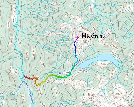 “Mt. Grant” is the unofficial name assigned by Fred Beckey in his 1981 Cascades Alpine Guide to a rather iconic and prominent summit immediately to the north of Eaton Lake. This peak is higher than the officially-named Eaton Peak a few kilometers to the south. The name of this peak had seen some confusions as prior to the publication of Beckey’s guidebook it had been referred as either “Crescent Peak” or “Eaton Peak North” in some local club trips. The older names understandably did not survive into this modern era and “Mt. Grant” is pretty much the one-and-only name for this peak on the internet nowadays. This name has also been adopted on the site bivouac.com, Google Earth and Matt Gunn’s Scrambles in SW British Columbia.