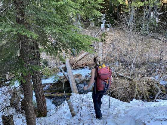 Elise ascending into the lower portion of this gully