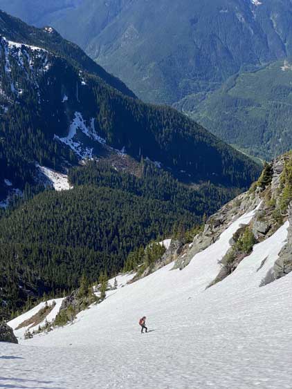 Vlad traversing into the massive south face gully that we’d ascend