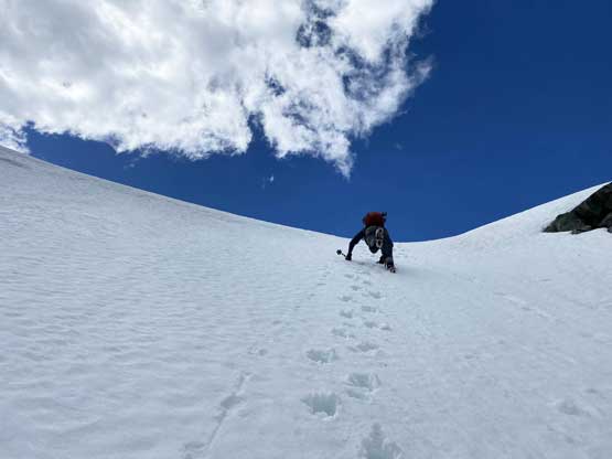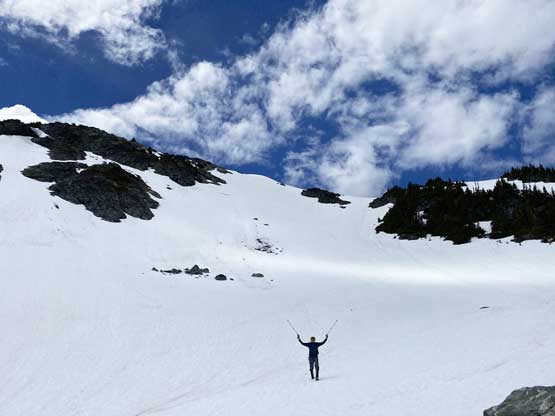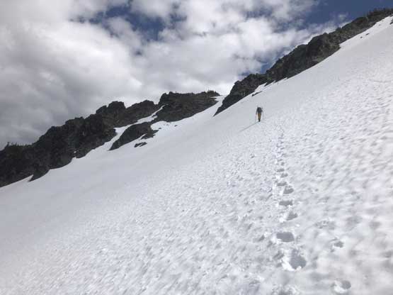 Prior to the trip we knew the crux would be the steep drop on the north side of “Stoyoma’s Widow” and we were correct. The descent looked to involve some steep snow climbing so we took the axes out and strapped crampons on. Getting into the couloir involved a bit of 45-degree down-climbing but the grade soon eased. We then took the crampons off and boot-skied down to the bottom, followed by some frustrating elevation regain to Widow/Bostock col. From there we ditched backpacks and rambled ahead, dealing with more frustrating up-and-downs and some minor route-finding and a lot of post-holing. It’s pointless to describe the exact route we took as all lines go.