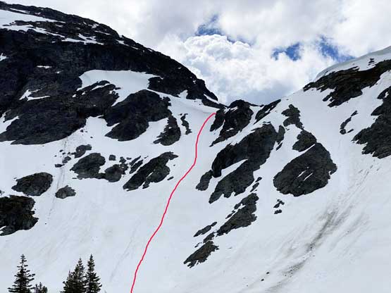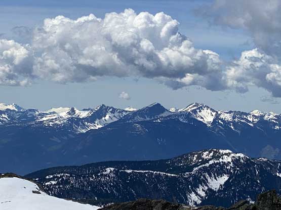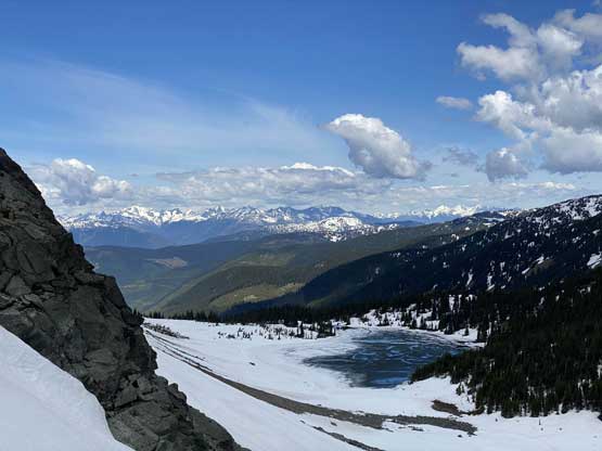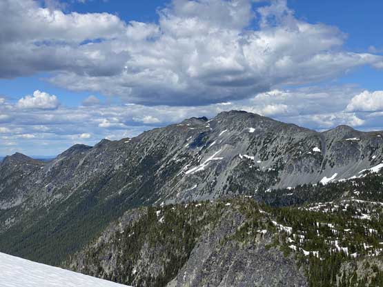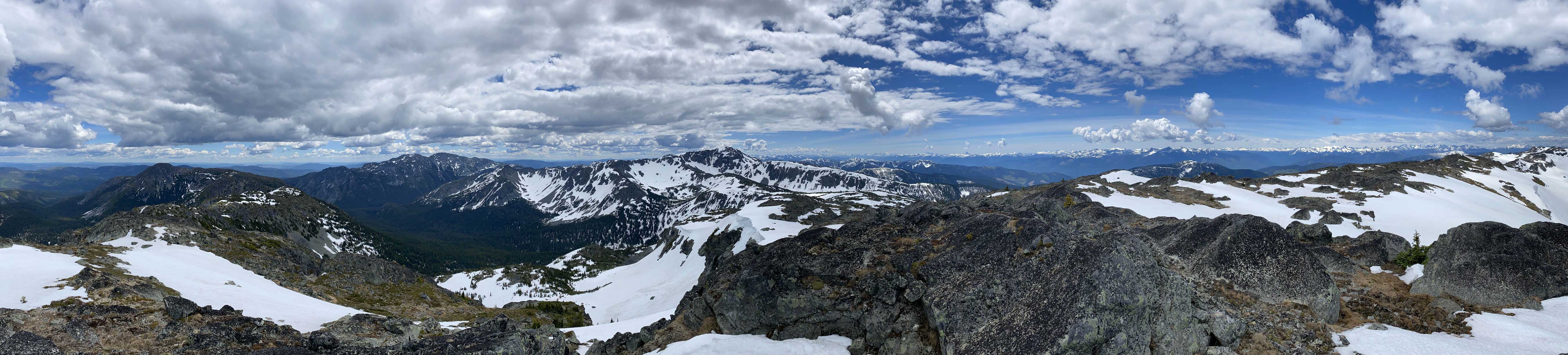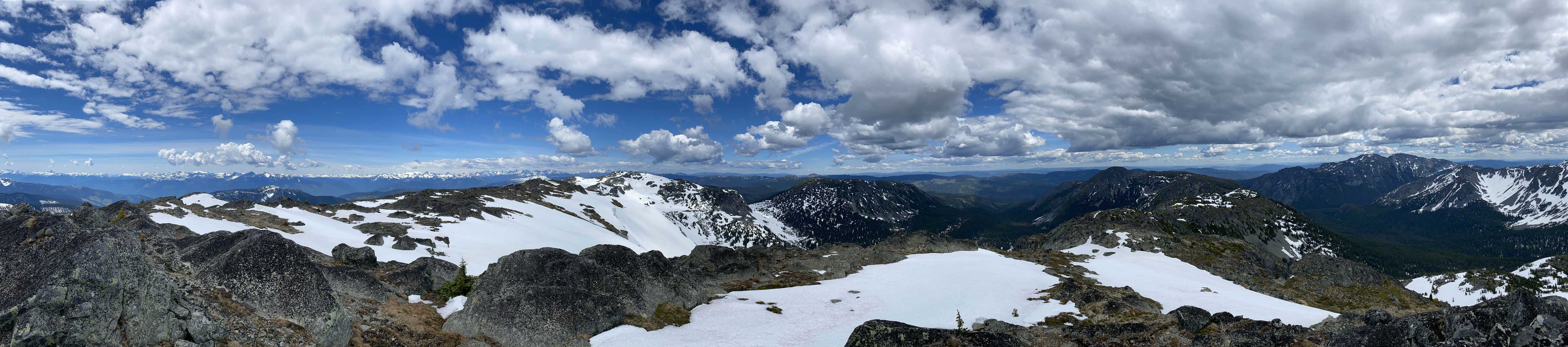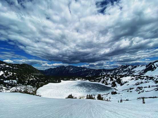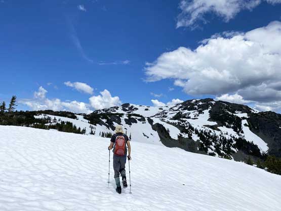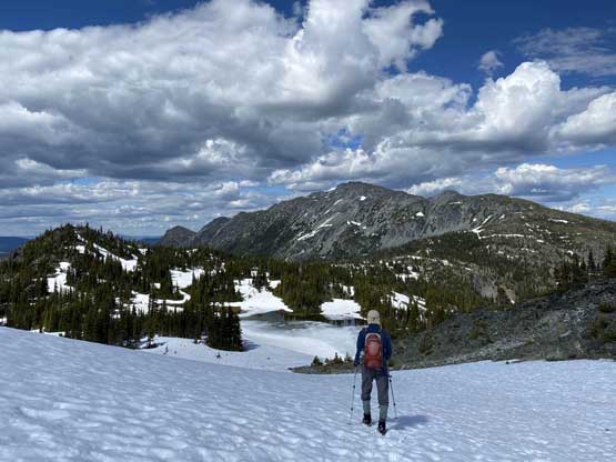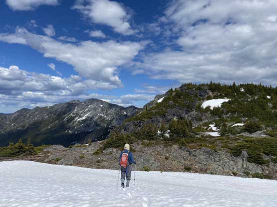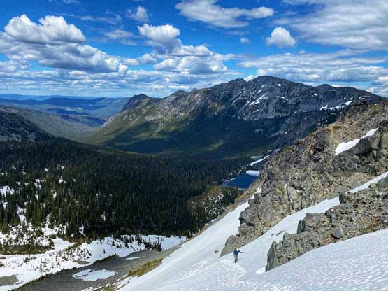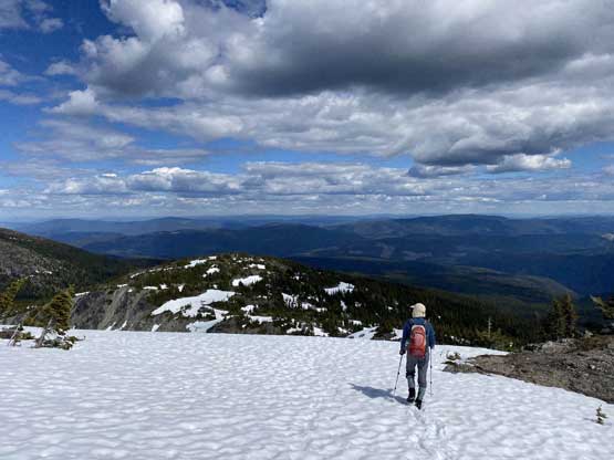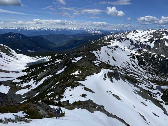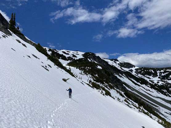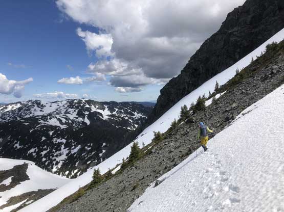 The summit boasts a huge cairn but we couldn’t find a register. Traversing to “Cowhead Peak” would involve at least 2 more hours and we were both tired and low on motivation so decided to head back. On the descent we utilized a nice snow gully on the south-west side to speed things up. And then we opted to stay on the ridge head for the north rib of “Stoyoma’s Widow” and the process was pretty boring and tedious with some up-and-downs and some minor bushwhacking. The ascent of the north rib of the widow was easier than appeared that we didn’t even need to use an ice axe nor crampons. Once topping out on the east shoulder of “Stoyoma’s Widow” we faced another important decision. I voted for descending to near Widow Lake in order to stay on snow for as much as we could. The boot-skiing was super fun and the traverse across the Widow Lake’s basin wasn’t bad, but the 200 m elevation regain at the end was exhausting. The snow was steep to about 40 degrees but soft enough that we didn’t need to use an ice axe.