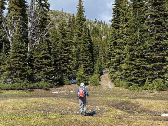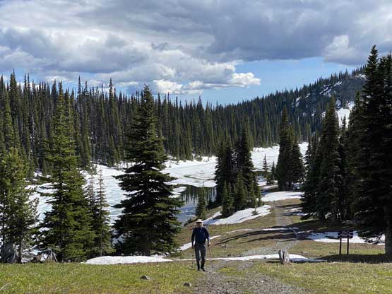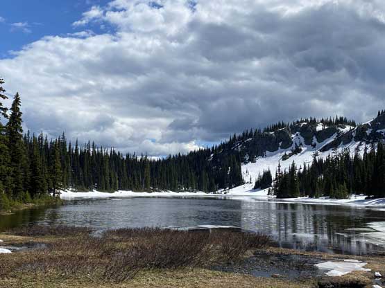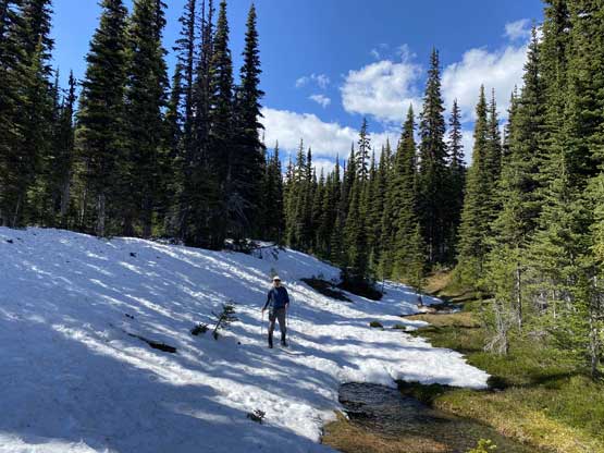 We took a long break after regaining to the ridge but then there came a few more frustrating bumps. At least now we had our own tracks to follow so not much mental work needed. After the last bump we decided to short-cut down to Cabin Lake taking advantage of the snow in the forest. The bushwhack wasn’t bad at all but unfortunately there came a few more major up-and-downs on the final few kilometers of road plod. None of us was expecting much of uphill travel on the road but too bad.