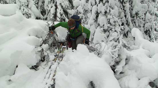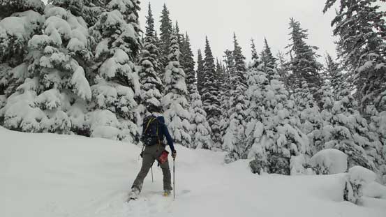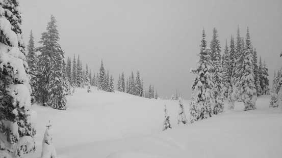 The ascent started pretty much right from Allison Pass (the highest point on Highway 3 from Hope to Priceton), but the deactivated Telecom Road was a bit confusing to navigate. Thankfully I had downloaded the GPX file from bivouac.com and there was some skin tracks from a day or two earlier. The tracks were covered by the storm snow but we could still follow them. A few massive dead falls near the start provided some fresh challenges but thankfully not too many of those higher up. Upon getting close to the end of this road we started to see a massive gully leading almost directly down to the highway and we both agreed to try it on the way down.