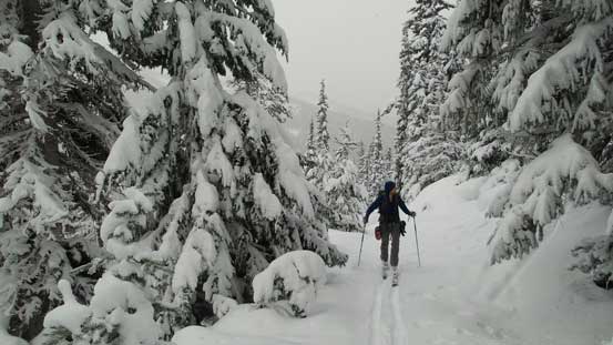 Mt. Kelly is one of those forested summits near the heart of Manning Provincial Park – the perfect place to go on a bad-weather day in the old man winter. This past Sunday was one of those “bad weather” days with a deep low pressure system blowing into the SW BC. It was nothing but pouring rain in Vancouver but Manning Park was forecasted to have much less precipitation (and mostly in the form of snow). A quick glance at John Baldwin’s ski book Alex and I decided on Mt. Kelly, but not doing much further research we still decided to head out at 5 AM in the morning…
