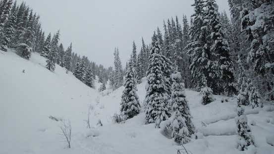 The tree skiing was as expected, pretty straightforward even for me. Soon enough we were back to that big gully. The snow was a bit heavy and the terrain wasn’t as open as we thought but still, it’s better than most of the ski trips I’ve done. We stayed exclusively on skier’s left side of the fall line and 450 vertical meters later we were back to (pretty much) the highway. We avoided the few dead falls by going into the forest.