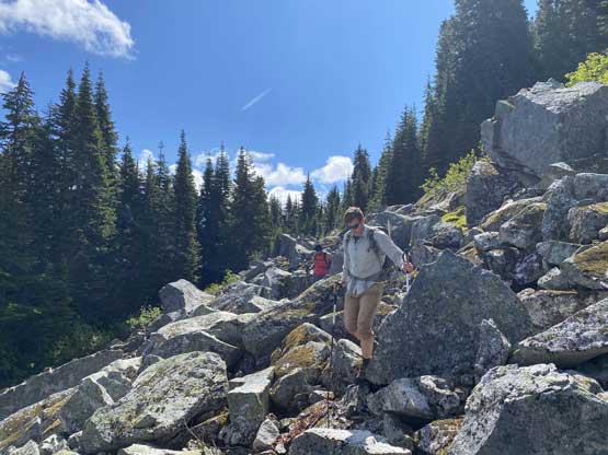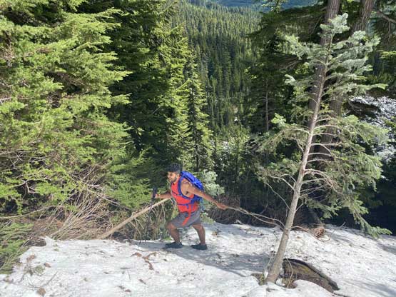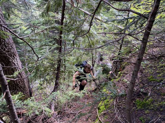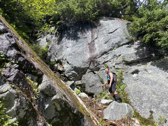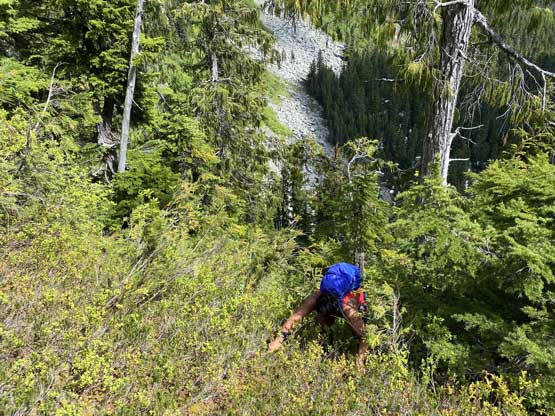 From the parking spot we easily walked up the deactivated spur road and picked up the excellent trail heading for “Paleface Pass”. The pass was reached in no time, but after that we were confused for not doing much homework. I remembered beta from earlier in this year that the normal route of Paleface Mountain goes up from the north side. We found an old logging road on the north side of the pass but the road soon came to a dead end. From there we had to deal with some side-hilling and bushwhacking, that eventually merged onto a long stretch of boulder fields. None of these terrain was pleasant but the boulders were at least faster than the brushes. There seemed to have a steep cliff band to gain to the col north of Paleface Mtn., and without detailed information we decided to just pick our own route. The route we took was “class 3 vege belay”. The problem solving was actually quite fun, but the bushwhack was quite dense and the ground was extremely slippery.