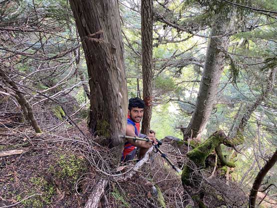 From the parking spot we easily walked up the deactivated spur road and picked up the excellent trail heading for “Paleface Pass”. The pass was reached in no time, but after that we were confused for not doing much homework. I remembered beta from earlier in this year that the normal route of Paleface Mountain goes up from the north side. We found an old logging road on the north side of the pass but the road soon came to a dead end. From there we had to deal with some side-hilling and bushwhacking, that eventually merged onto a long stretch of boulder fields. None of these terrain was pleasant but the boulders were at least faster than the brushes. There seemed to have a steep cliff band to gain to the col north of Paleface Mtn., and without detailed information we decided to just pick our own route. The route we took was “class 3 vege belay”. The problem solving was actually quite fun, but the bushwhack was quite dense and the ground was extremely slippery.