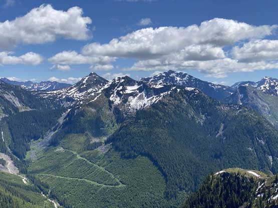 Paleface Mountain is one of the minor summits right next to Chilliwack Lake but offers some nice views of the BC Cascades. The peak itself is nothing but a walk-up and the access had been significantly improved in the last couple years thank to the new logging in Paleface Creek drainage. Earlier in this year the Paleface FSR had seen a huge fallen log blocking the road but with excellent work done by 4×4 enthusiasts the log’s been removed, and now with a high clearance 4WD vehicle one can drive to 1200 m elevation and the peak can be ascended in a mere couple hours. There’s a good trail leading up to “Paleface Pass” but from there one needs to do some cross country travel and bushwhack to reach the summit. The easiest route seems to be on the north side but there are multiple routes that all go.