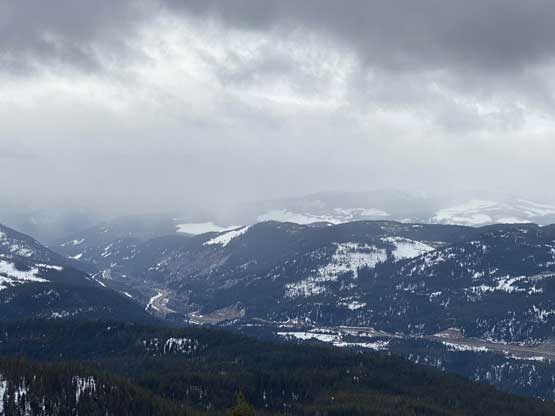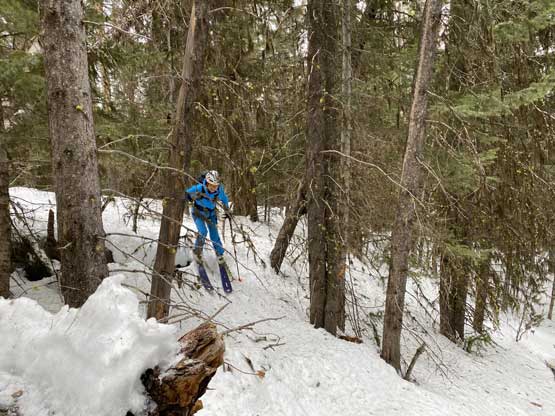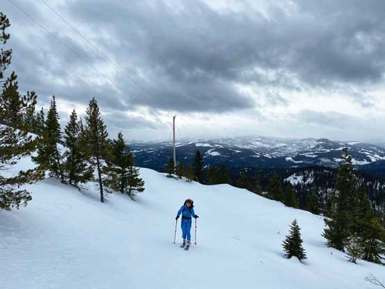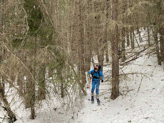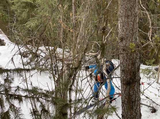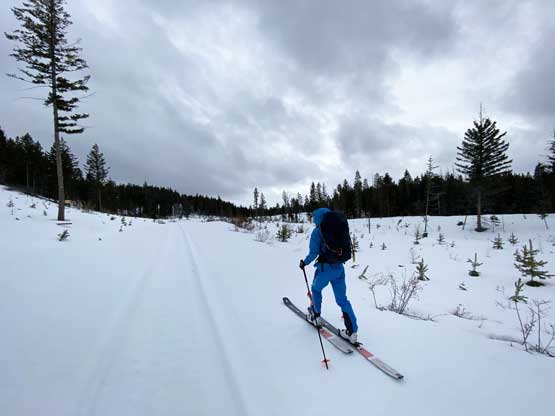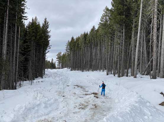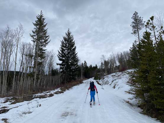 The roads that I was going to use weren’t shown on Gaia GPS map but I had also downloaded the satellite images, so our navigation was mostly used by those images. The first 2 km was fairly icy but the conditions improved higher up. The first major intersection came at around 1200 m elevation where we took the right branch heading southward. The sled tracks had gone both ways so we still didn’t have to break trail. It seemed like the weather was going to stay cold for the whole day so we might not need to break trail after all. This long stretch of skinning due south had a few minor up-and-downs that would come a bit annoyingly on the return but that’s something to worry about later. Upon skinning towards the next major intersection we were surprised to see the roads ahead were doing some slight descending AND being plowed likely due to active logging. I didn’t want to take skis off so led us into the forest hoping to short-cut that stretch. This turned out to be a mistake as the bushwhacking was much worse than I thought. I kept forgetting how bad the bushwhacking was in these drier areas. The forest was dense, the tree branches were stiff and there were a shit ton of dead-falls to negotiate. To correct the mistake we descended onto that road but we found a narrow and skinnable shoulder so that we didn’t have to actually descend onto the road.