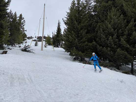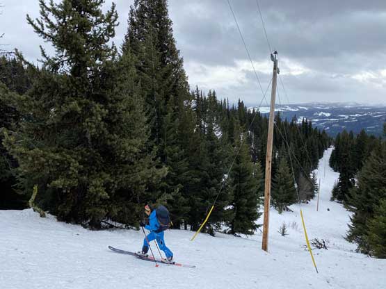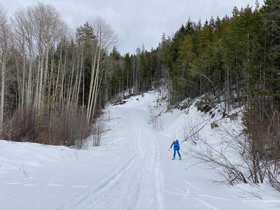 The summit was unfortunately cold and windy so we didn’t linger too long. The last time I had put skis on my feet was February 2019 so I was curious whether or not I still remembered how to ski. It turned out that the muscle memories were not easily forgettable. I had no problem descending the powerline clear-cut that would be equivalent to a “blue run” in a resort. That section of the young trees was challenging that I had to descend by lots of side-slipping and a few kick-turns. Once descending into the lower clear-cut we had an amazing few hundred meters’ of skiing down to the road. Lily opted to carry her skis and boot-pack on that plowed road while I decided to put skins back on (my skis were too heavy to carry on my arms). The skiing back down the roads were super fast and fun that this eventually turned out to be an enjoyable trip on skis. In my past experience I would end up questioning my sanity for 4 ski trips out of 5, so this trip was surprisingly sweet.