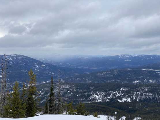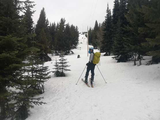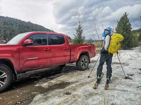 The only reason I would bag peaks in this area is when the rain pushed me to drive farther. This happened to be the case on this past Sunday. The weather was not sunny even for Merritt area but at least there’s no precipitation in the forecast, whereas the South Coast would receives more than 20 cm of snow or rain. I thought about to just solo it on snowshoes but I checked in with Lily at the last minute. Lily would not be interested in such a dumpster objective but what about to ski it. The route was flat enough that the skiing was well within our level, so the trigger was pulled. We left Vancouver at 6 am in the morning and drove through some downpours. The road over Coquihalla Pass then involved some careful winter driving but as forecasted, the precipitation stopped as we drove down the other side of the pass towards our objective. I had no idea about the status of the logging roads we were going to use. I was hoping for some snowmobile tracks to ease our trail-breaking effort and I sure was not disappointed. There’s one truck parked at the Highway exit and there were sled tracks going in the direction we wanted. Another good news was that despite the lack of snow in this elevation, the road was skinnable from the truck at under 850 m elevation.