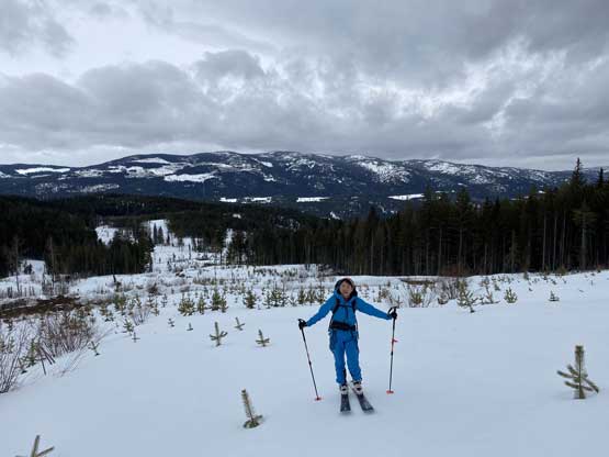 The only reason I would bag peaks in this area is when the rain pushed me to drive farther. This happened to be the case on this past Sunday. The weather was not sunny even for Merritt area but at least there’s no precipitation in the forecast, whereas the South Coast would receives more than 20 cm of snow or rain. I thought about to just solo it on snowshoes but I checked in with Lily at the last minute. Lily would not be interested in such a dumpster objective but what about to ski it. The route was flat enough that the skiing was well within our level, so the trigger was pulled. We left Vancouver at 6 am in the morning and drove through some downpours. The road over Coquihalla Pass then involved some careful winter driving but as forecasted, the precipitation stopped as we drove down the other side of the pass towards our objective. I had no idea about the status of the logging roads we were going to use. I was hoping for some snowmobile tracks to ease our trail-breaking effort and I sure was not disappointed. There’s one truck parked at the Highway exit and there were sled tracks going in the direction we wanted. Another good news was that despite the lack of snow in this elevation, the road was skinnable from the truck at under 850 m elevation.