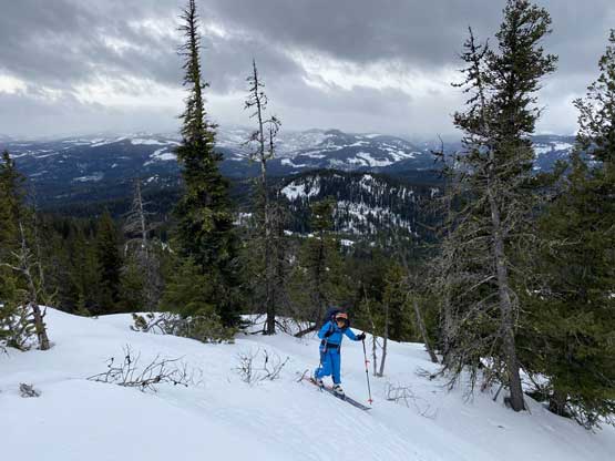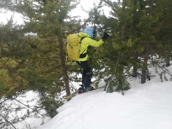 The roads that I was going to use weren’t shown on Gaia GPS map but I had also downloaded the satellite images, so our navigation was mostly used by those images. The first 2 km was fairly icy but the conditions improved higher up. The first major intersection came at around 1200 m elevation where we took the right branch heading southward. The sled tracks had gone both ways so we still didn’t have to break trail. It seemed like the weather was going to stay cold for the whole day so we might not need to break trail after all. This long stretch of skinning due south had a few minor up-and-downs that would come a bit annoyingly on the return but that’s something to worry about later. Upon skinning towards the next major intersection we were surprised to see the roads ahead were doing some slight descending AND being plowed likely due to active logging. I didn’t want to take skis off so led us into the forest hoping to short-cut that stretch. This turned out to be a mistake as the bushwhacking was much worse than I thought. I kept forgetting how bad the bushwhacking was in these drier areas. The forest was dense, the tree branches were stiff and there were a shit ton of dead-falls to negotiate. To correct the mistake we descended onto that road but we found a narrow and skinnable shoulder so that we didn’t have to actually descend onto the road.