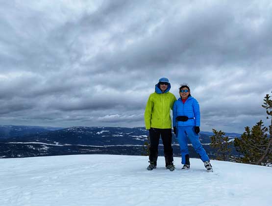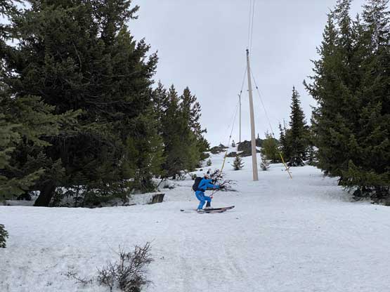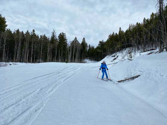 The summit was unfortunately cold and windy so we didn’t linger too long. The last time I had put skis on my feet was February 2019 so I was curious whether or not I still remembered how to ski. It turned out that the muscle memories were not easily forgettable. I had no problem descending the powerline clear-cut that would be equivalent to a “blue run” in a resort. That section of the young trees was challenging that I had to descend by lots of side-slipping and a few kick-turns. Once descending into the lower clear-cut we had an amazing few hundred meters’ of skiing down to the road. Lily opted to carry her skis and boot-pack on that plowed road while I decided to put skins back on (my skis were too heavy to carry on my arms). The skiing back down the roads were super fast and fun that this eventually turned out to be an enjoyable trip on skis. In my past experience I would end up questioning my sanity for 4 ski trips out of 5, so this trip was surprisingly sweet.