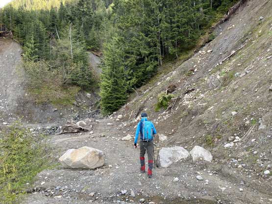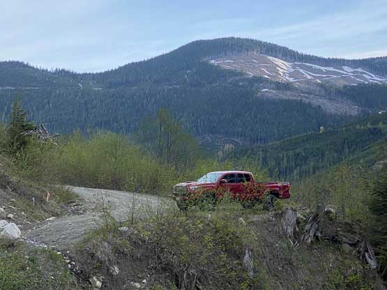 The way I wanted to do Mt. Barr and “Sowerby Peak” was always from Jones Lake via a steep bushwhack until Duffy’s “Unnecessary Crew” published an alternate approach from east fork of Hunter Creek. Duffy’s trip was last Saturday and the report made it look like a smooth sail without any bushwhacking, so Alex and I decided to immediately follow their route the weekend after. My day-off was on Sunday. The best weather was on Saturday but Sunday’s weather was also “acceptable” so we pulled the trigger. Alex and I met in Abbotsford at 5 am and drove up Highway 1 in my trusty Taco. The Hunter Creek FSR was as expected, steep and loose in spots. The worst was actually to crawl up the initial hill above the highway that almost required me to switch to 4Low. The deactivated portion of this road beyond the hydro project was quite long resulting in a slower-than-expected drive, but we had no issue making to where the previous group stopped at 950 m elevation. The road was blocked by boulders beyond that spot and only ATVs could drive across the obstacles. The spot where we made the turn-around could only park 2 vehicles max.