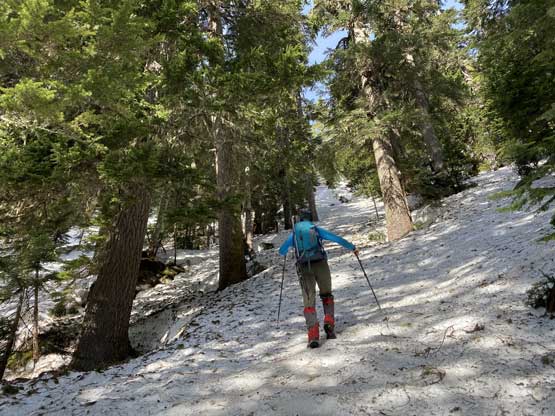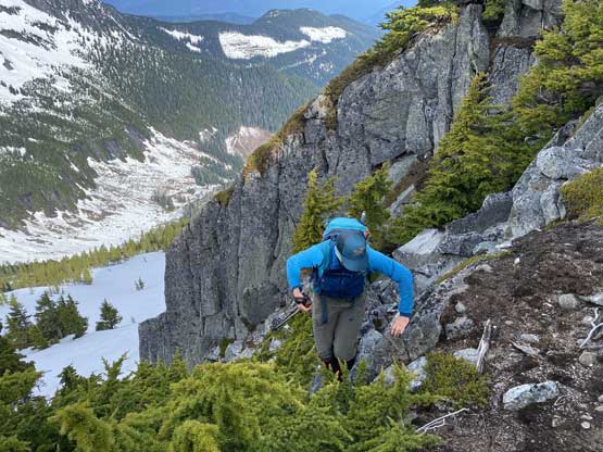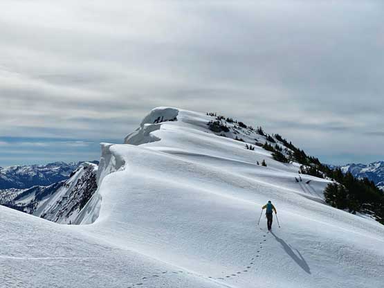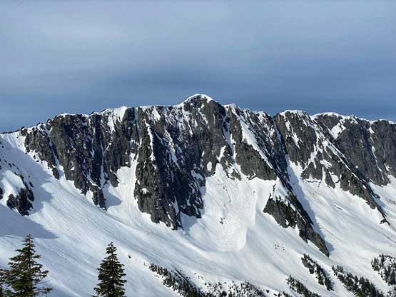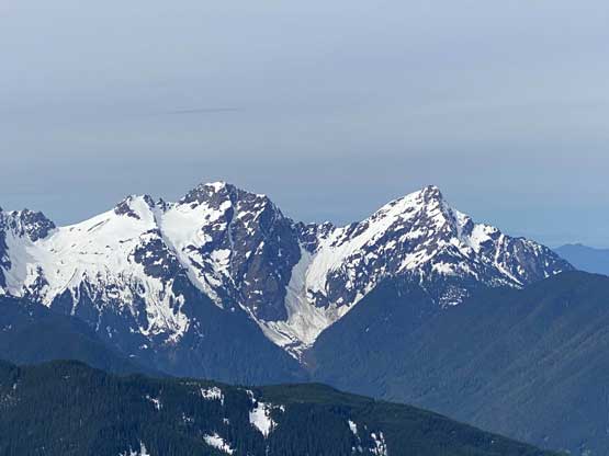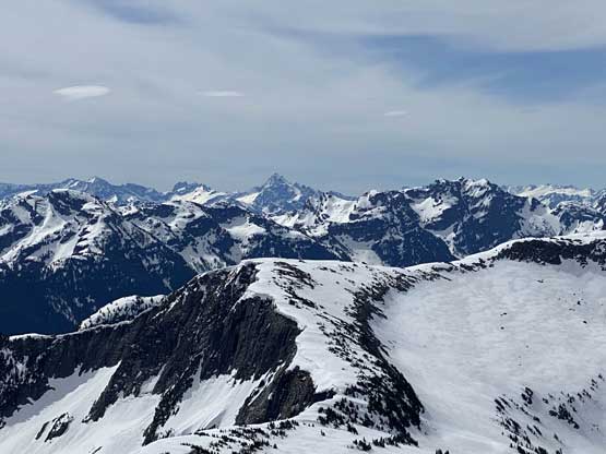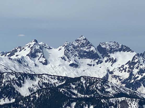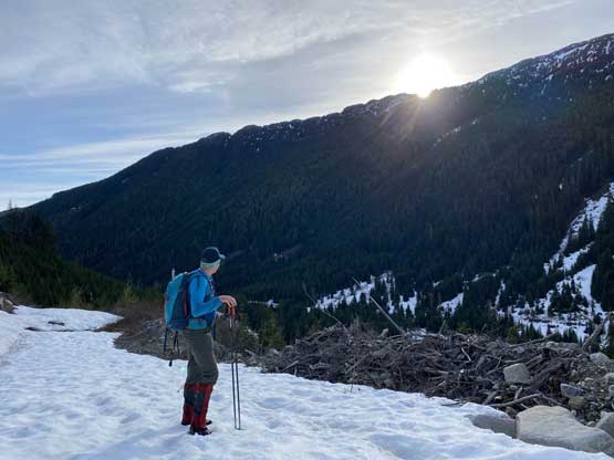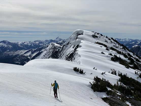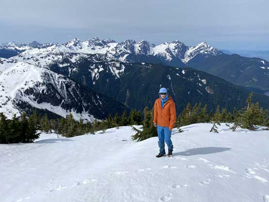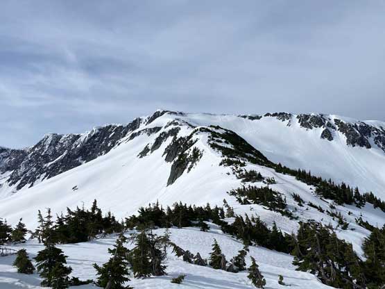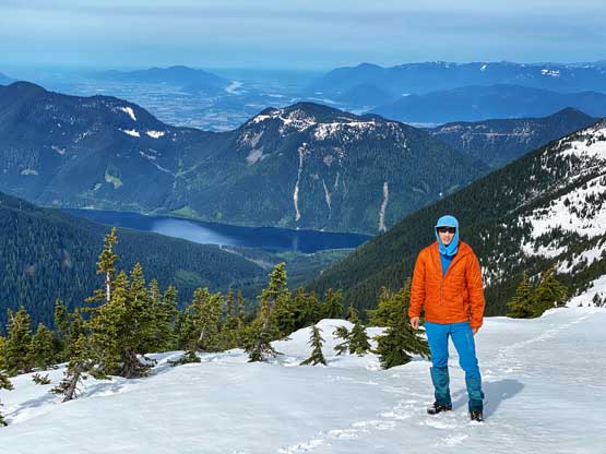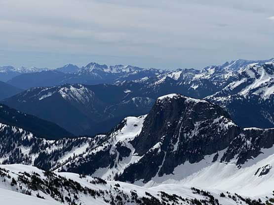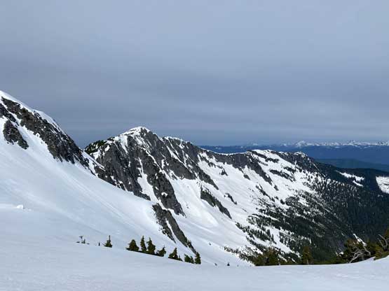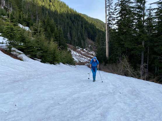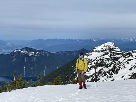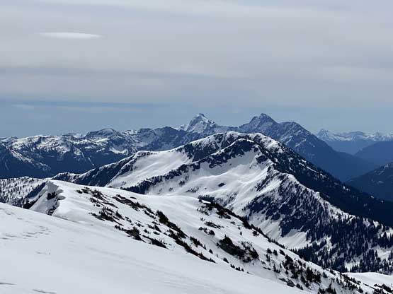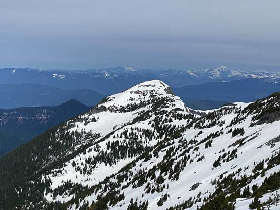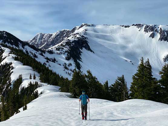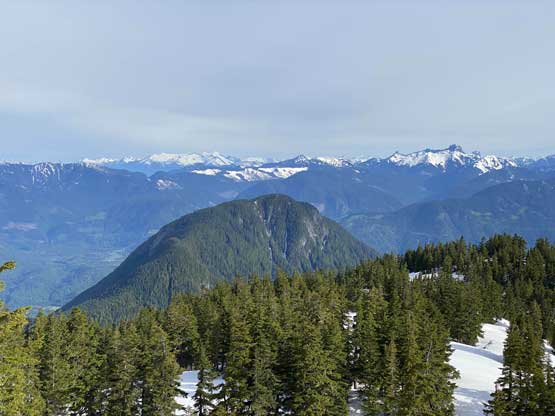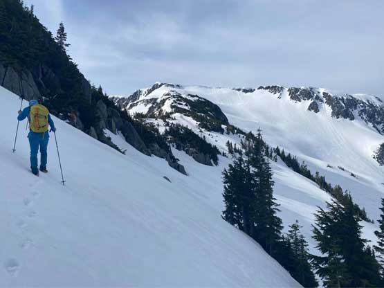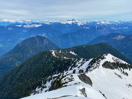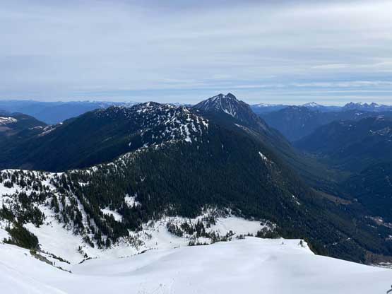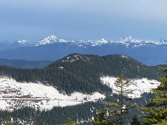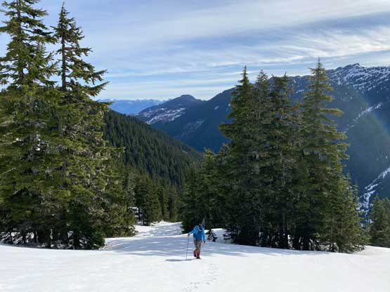 About 15 minutes into the plod we started to encounter patchy snow and the snow did not become continuous until another km or so further at around 1050 m elevation. The road then did a rightward turn and after that, we started to gain elevation rapidly. At 1300 m the last switchback of the road we followed Duffy’s GPS track bailing into the forest. The next while was grunting 300 vertical meters up this steep forest to the ridge that divides the east and west forks of Hunter Creek. This zone required a lot of step-kicking but we both managed it without having to take out ice axe nor donning crampons. Once hitting the ridge the views suddenly opened up.