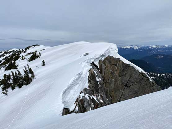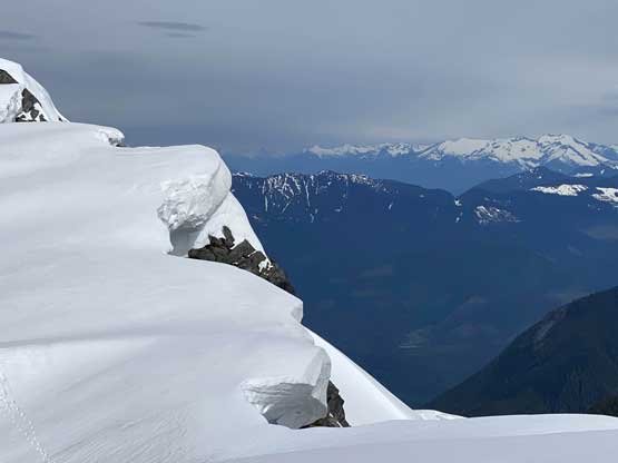 The route brought us directly onto the “west summit” of Sowerby Peak which was reported to be only 3 m lower than the east one. The traverse to the east (true) summit was mostly straightforward but we did have to be careful about the cornices. There were monstrous cornices dangling over the north face waiting to drop. We did not do the final 2-meter elevation gain fearing the entire “summit” was on a gigantic cornice. Therefore we did not get that 360-degree panoramic view from this peak.
