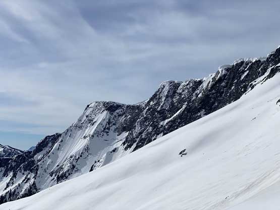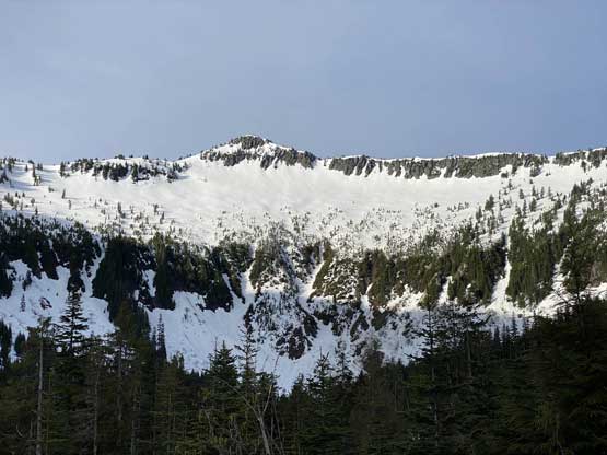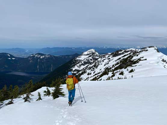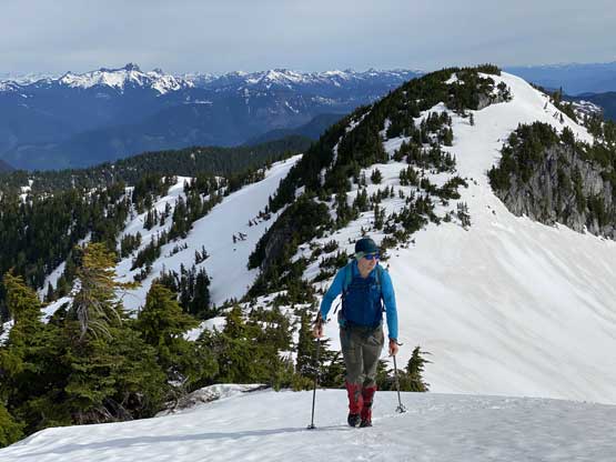 About 15 minutes into the plod we started to encounter patchy snow and the snow did not become continuous until another km or so further at around 1050 m elevation. The road then did a rightward turn and after that, we started to gain elevation rapidly. At 1300 m the last switchback of the road we followed Duffy’s GPS track bailing into the forest. The next while was grunting 300 vertical meters up this steep forest to the ridge that divides the east and west forks of Hunter Creek. This zone required a lot of step-kicking but we both managed it without having to take out ice axe nor donning crampons. Once hitting the ridge the views suddenly opened up.