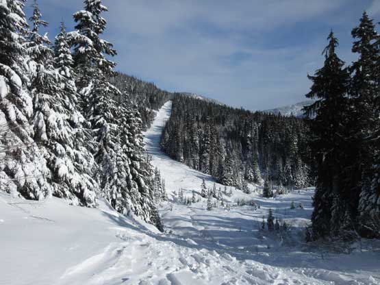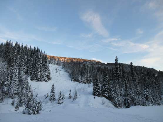 This past Tuesday seemed like the right day with favourable weather along with some bomber avalanche conditions. The downside was the extremely cold temperature because we were hitting by an arctic high pressure system. I was expecting something like -20 degrees in the alpine with possible of strong outflow wind but such was not a reason to play the laziness game when I’m determined to head out. As usual I had trouble falling asleep before midnight so as a result I only got about three hours of sleep before the alarm went off at 4 am. I dragged my tired self out of the comfort zone of home and started driving eastwards down Highway 1. The outflow wind was crazy. I could see the speed-limit plates making some 60+ degrees angle with the vertical axis and I had to gas harder than normal in order to keep the 110 km/h speed (travelling directly against the wind). The temperature was reasonable in Fraser Valley but dipped rapidly as I ascended onto the Coquihalla, that by the time I exited at Falls Lake my thermometer was showing a burly -25 degrees… It was more brutal than expected, but at this point I just had to suck it up.