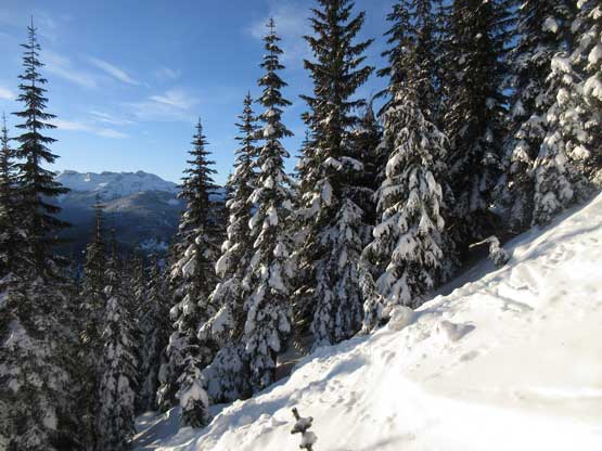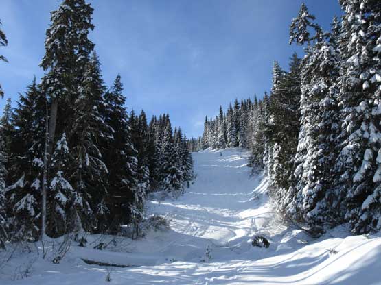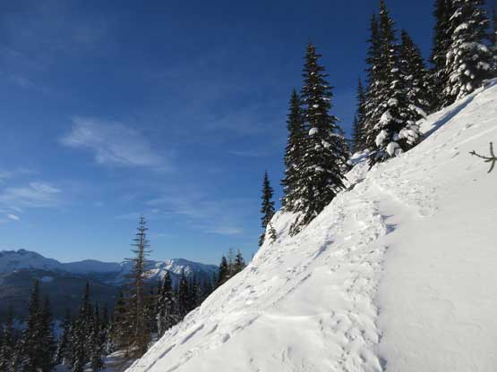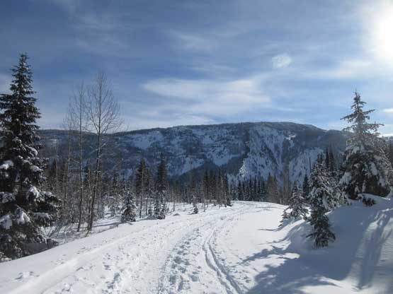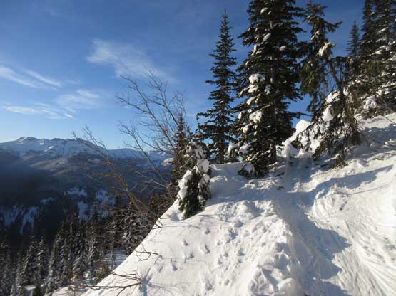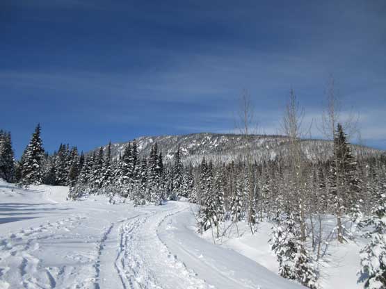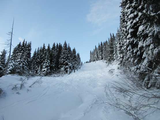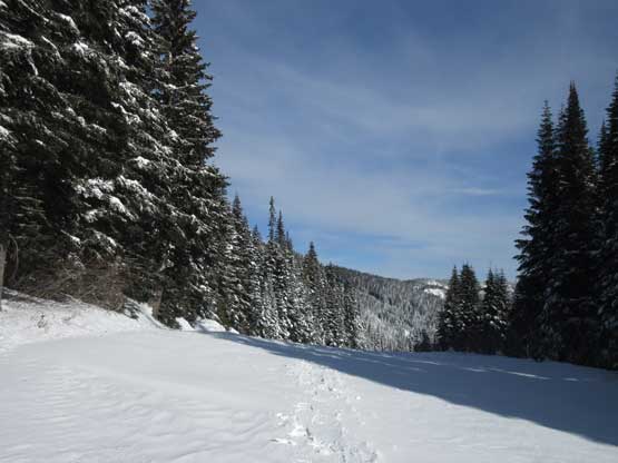 Stepping out of the truck was difficult but the worse was strapping snowshoes on. The rubber straps were so stiff (due to the extreme coldness) that I had to pull very hard to barely fit my boots to the ‘shoes. This gear transition took quite a bit of strength out of me and for some reason I was feeling an unusual lack of energy right off the bat. The first kilometer down the closed road went without event and then I turned left up the cutblock. The cutblock was completely tracked out by skiers but I could see that nobody had gone here since Sunday’s precipitation. There’s more elevation gain in the cutblock than anticipated. I correctly picked a set of skin tracks and entered the forest where the road turned downhill. It might be difficult to locate where exactly to bail into the forest, but any spot in that general zone would work, in my opinion. It seemed like the track was made by more than just one group of skiers so from this point onward I decided to just follow the tracks. The skin track deviated from my planned route and went farther climber’s right (NE) than expected, but again I decided to put my fate on the track, so carried on.
