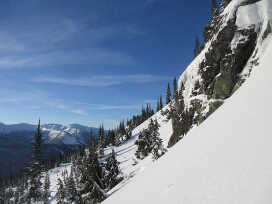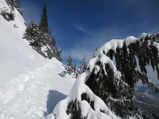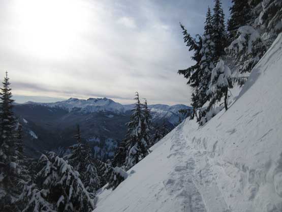 There were sections where I couldn’t see the main set of skin track anymore due to the recent precipitation along with the wind transportation, but with a bit of guess work it’s not difficult to pick up the track again. About one third to halfway up the track dumped me right underneath an imposing bluff and started traversing horizontally out climber’s right (NE) skirting the base of the bluff. This traversing direction was opposite of what I had researched, but at this point it seemed like following the track was the smartest idea, so I carried on. The traverse was steep, narrow and moderately exposed that snowshoes barely worked. Higher up I followed the track zig-zagging a few times and made a long traverse climber’s left (SW). The route finally made sense now.