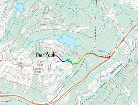 The stretch of Zopkios Ridge rises abruptly off the busy Coquihalla Highway and Thar Peak is the easternmost summit along the ridge. It’s rather geologically insignificant, and not nearly as iconic as the nearby Yak Peak, but does attract skiers in the South Coast because of the short approach and the sweet (and steep) terrain on its slopes. The standard route goes up the broad S/SE flanks that has a consistent grade of 30+ degrees, and the north side bowl offers some of the best, and easily accessible powder in the area. For ambitious skiers and climbers the north couloir offers another exciting line, shooting 500 vertical meters straight up from Falls Lake. A few years ago I had bagged Zoa Peak and Nak Peak in Coquihalla Pass but never returned for Thar Peak nor Yak Peak. Their easiness of access meant both could be done in half of a day and I was in no hurry for trips like that. I had wanted to save Thar Peak for a “morning exercise” – to drive out in the dark, climb in the morning and get back to Vancouver for work in afternoon.