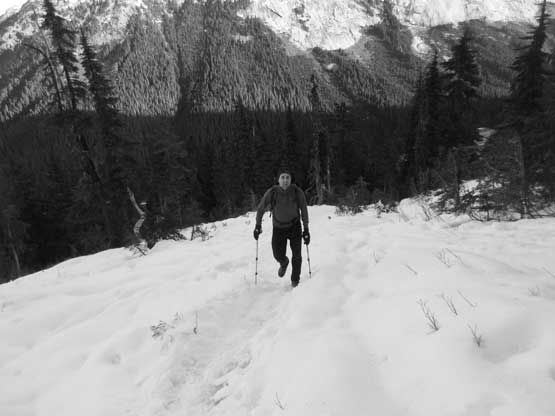In about 2 hours we had parked at Zopkios Rest Area on the north side of the highway and the first business was finding the Needle Ridge trail-head on the south side, which was interestingly not very close to where we parked… The trail itself was well marked but icy enough to warrant some caution. Another hour later we had crested the forested “Needle Ridge” and it’s there that the icy and frozen mud finally transitioned into continuous snow. Thank to the foot traffic on this trail we did not need snowshoes until very much close to the first highpoint of the day – the west shoulder of Needle Peak. Unfortunately all previous traffic stopped there so we were on our own breaking trail down to Needle/Flatiron col. There’s about 50 m of elevation drop and the condition was not the most ideal. There’s a thick layer of freeze-thaw crust that had about 20% chance of breaking upon stepping on.