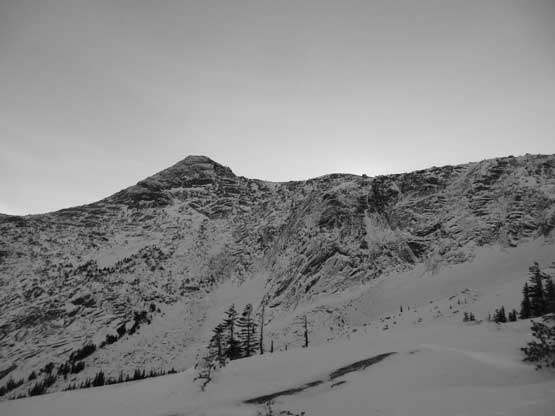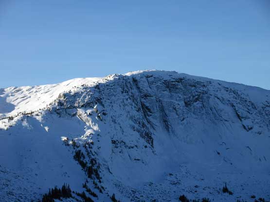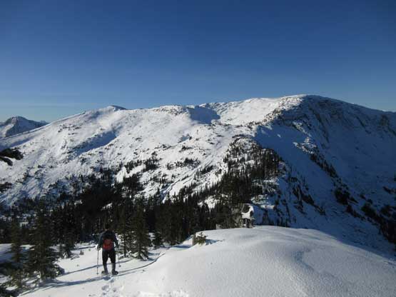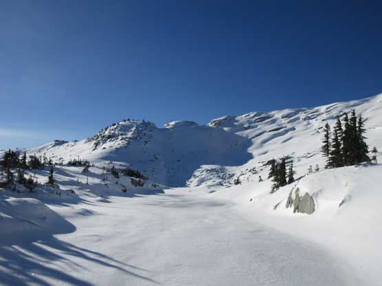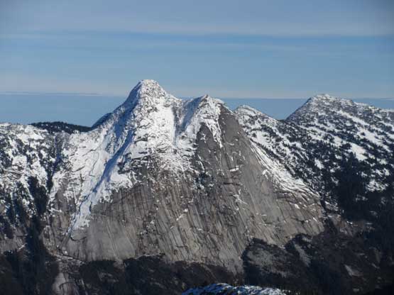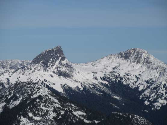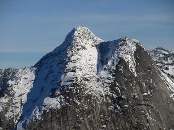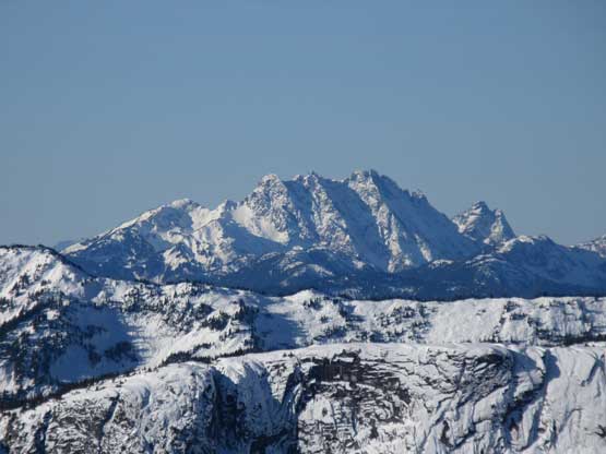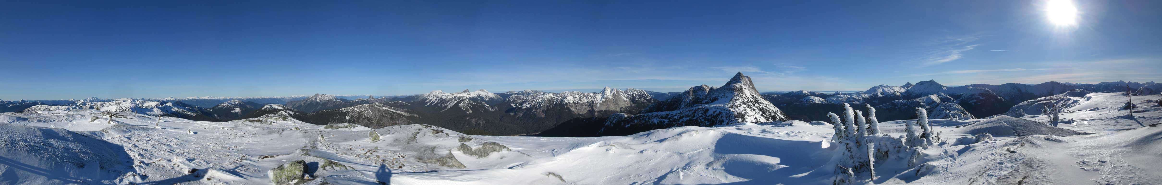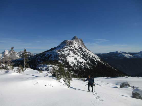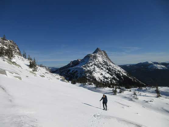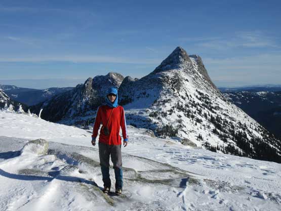 From the Needle/Flatiron saddle we followed the connecting ridge up the NE Ridge of The Flatiron until underneath an imposing rock buttress. The vertical step would require technical mixed climbing so we traversed leftward into a broad cirque above a small, frozen tarn. From there it’s just a matter of putting one foot in front of another snowshoeing straight up to the flat summit with a green missile tower.. The crust was very supportive on this aspect making some fast travel. We explored the summit dome for a while in order to soak in all views.