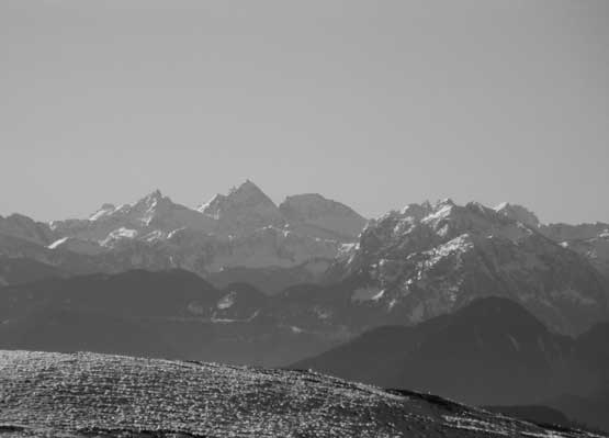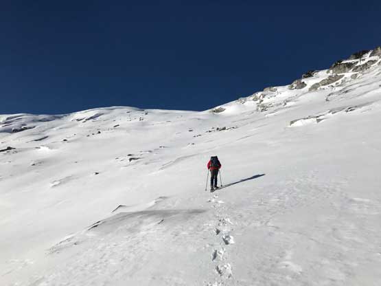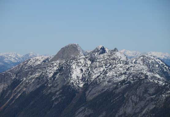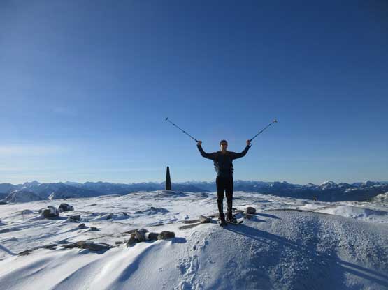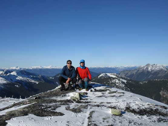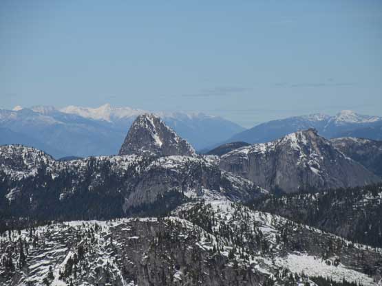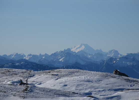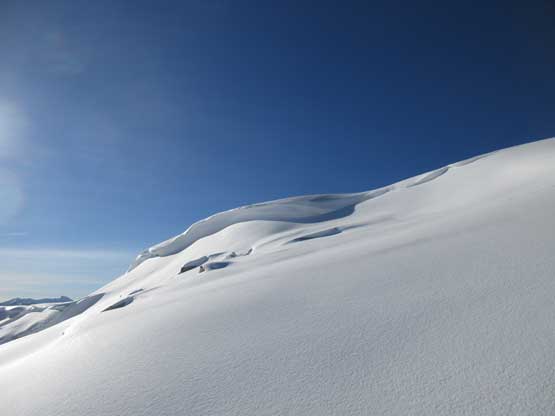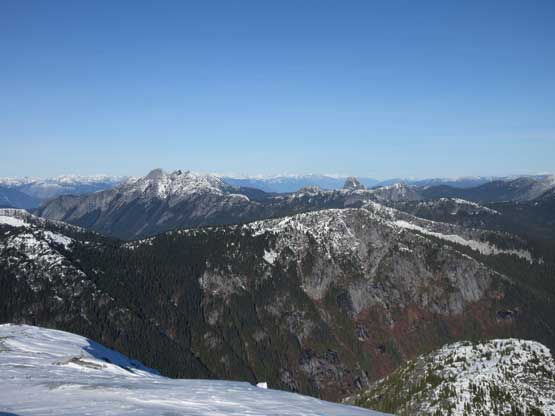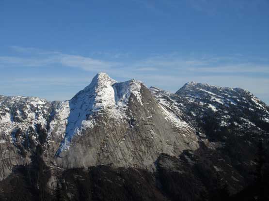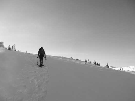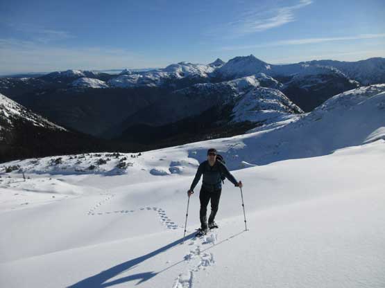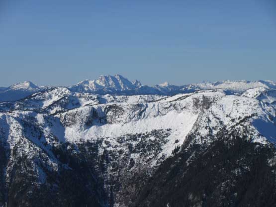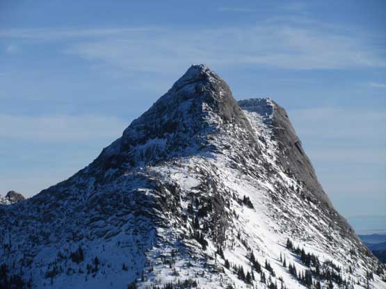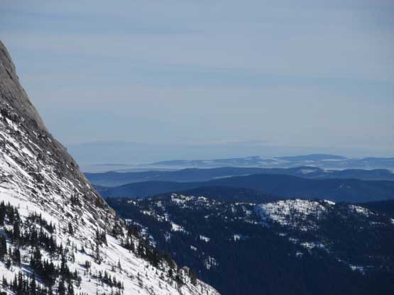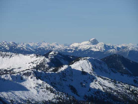 From the Needle/Flatiron saddle we followed the connecting ridge up the NE Ridge of The Flatiron until underneath an imposing rock buttress. The vertical step would require technical mixed climbing so we traversed leftward into a broad cirque above a small, frozen tarn. From there it’s just a matter of putting one foot in front of another snowshoeing straight up to the flat summit with a green missile tower.. The crust was very supportive on this aspect making some fast travel. We explored the summit dome for a while in order to soak in all views.