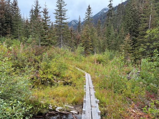 I woke up at 4:50 am and was quickly on the road. The Tacoma had been parked in the garage for over 2 months so I was sure that it wanted to breathe in some fresh air. The weather was unfortunately not as promising as I was hoping for. There was some continuous drizzling between Hope and Coquihalla Pass but the precipitation stopped minutes before I exited the highway onto Coldwater FSR. I could finally see some patches of blue skies further up the corridor towards Merritt but that’s not where I was going. It was not sunny at Zum Peak but at least the summit wasn’t engulfed in the clouds. The 7 km driving up Coldwater FSR was much rougher than I thought. I had been up this way 9 years ago and it was basically cruise sailing to the recreation site at the base of the peak, but it was no longer the case anymore. A wash-out not far in required high clearance to negotiate, and the second half of this access road had become overgrown. There was evidence of recent cutting of alders but continuous pin-stripping was unavoidable. It took me a while to drive these few kilometers but eventually I turned the truck around and parked at the site.