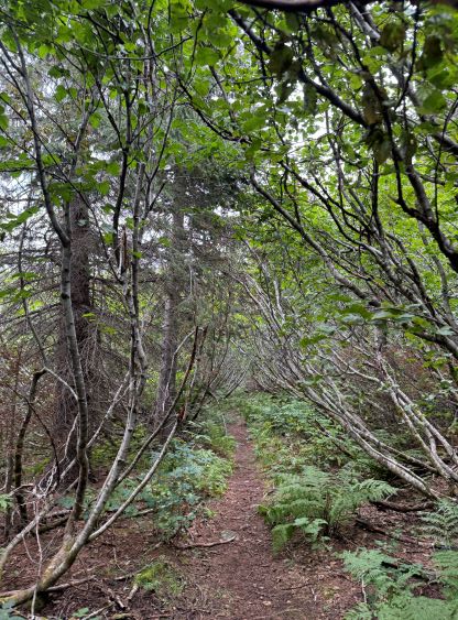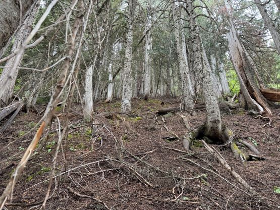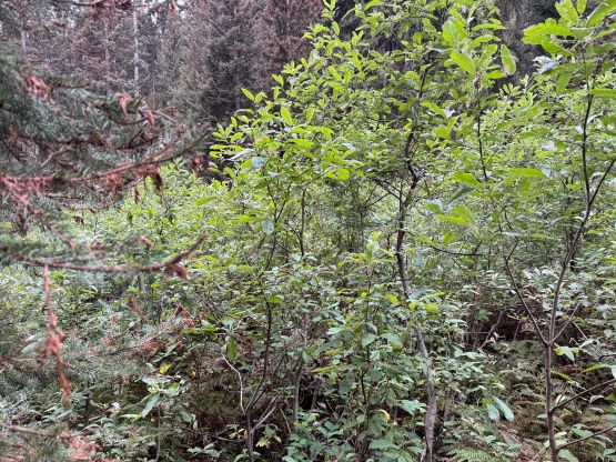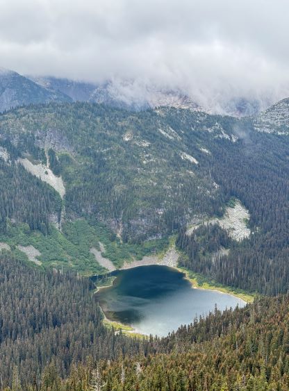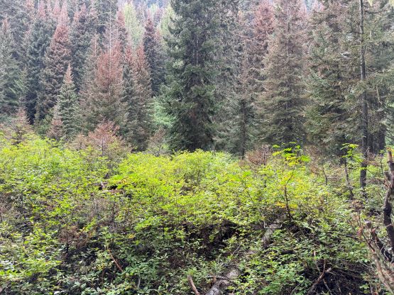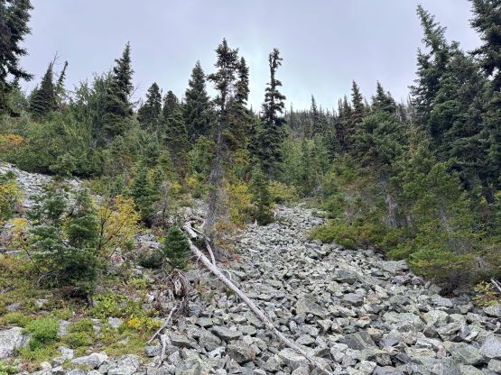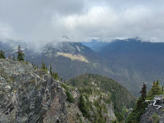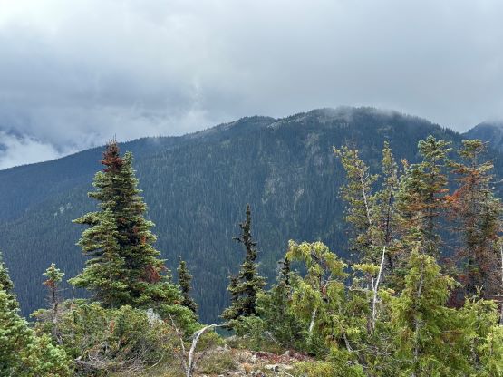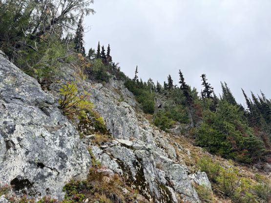 I did not bother to read Simon’s trip report as the route is obvious. I picked up the slightly overgrown but well-defined trail heading towards Little Douglas Lake but I would leave the trail before reaching the lake. It wouldn’t matter where exactly to start bushwhacking as there’s no clear “better solution”. The bushwhacking was actually better than I thought. It was never nasty, but rather unrelenting for 500 vertical meters. Another thing worth nothing is that I had opted to wear the Arc’teryx trail shoes instead of my go-to mountaineering boots. The trail shoes had proven themselves on all terrain except for the steep bushes so I wanted to test them out. I generally prefer boots when it comes to bushwhacking as the boots give much better edging but now with shoes I had to rely more on smearing. For a while I was going much slower than anticipated and I felt like I was re-learning how to bushwhack, but I got the rhythm going fairly quickly. The worst was a band of steep forest with needles making the ground extremely slippery but as long as I could reach out to some vege belay I felt fine. Higher up the undergrowth in the forest gave way to some talus fields which eventually turned into class-2 scrambling. I took a more direct line up the south slopes and encountered no further difficulty except for a few bands of thick brushes. The summit was reached in 1.5 hours from the truck and I lingered up there for quite a while hoping the clouds would lift. It never did and the weather would only become worse later.