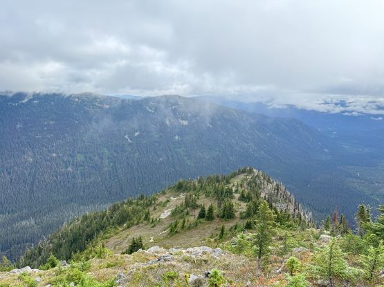I did not bother to read Simon’s trip report as the route is obvious. I picked up the slightly overgrown but well-defined trail heading towards Little Douglas Lake but I would leave the trail before reaching the lake. It wouldn’t matter where exactly to start bushwhacking as there’s no clear “better solution”. The bushwhacking was actually better than I thought. It was never nasty, but rather unrelenting for 500 vertical meters. Another thing worth nothing is that I had opted to wear the Arc’teryx trail shoes instead of my go-to mountaineering boots. The trail shoes had proven themselves on all terrain except for the steep bushes so I wanted to test them out. I generally prefer boots when it comes to bushwhacking as the boots give much better edging but now with shoes I had to rely more on smearing. For a while I was going much slower than anticipated and I felt like I was re-learning how to bushwhack, but I got the rhythm going fairly quickly. The worst was a band of steep forest with needles making the ground extremely slippery but as long as I could reach out to some vege belay I felt fine. Higher up the undergrowth in the forest gave way to some talus fields which eventually turned into class-2 scrambling. I took a more direct line up the south slopes and encountered no further difficulty except for a few bands of thick brushes. The summit was reached in 1.5 hours from the truck and I lingered up there for quite a while hoping the clouds would lift. It never did and the weather would only become worse later.