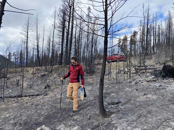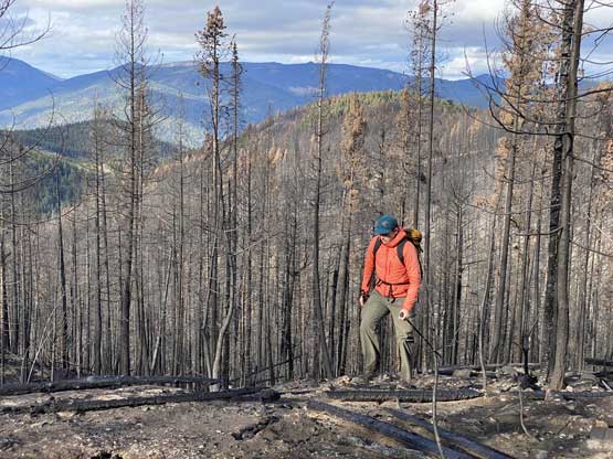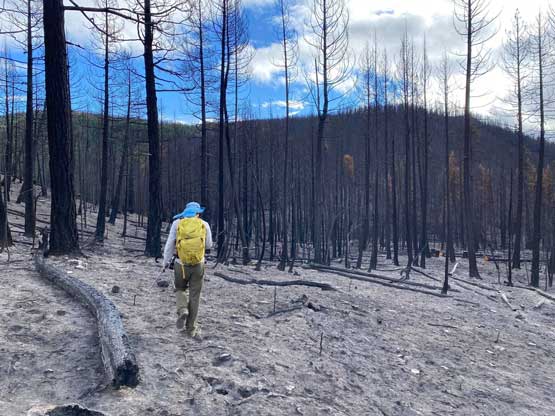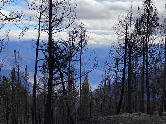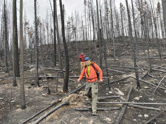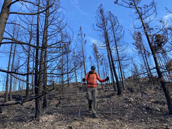 After taking a few victory shots we immediately started the descent. I led the way back sticking as close to our own GPS tracks as possible. We managed to avoid that small section of the un-burnt forest by staying farther to the south and this way we stayed entirely on the burnt forest on the return hike.