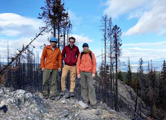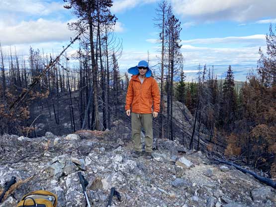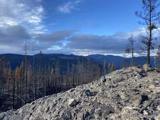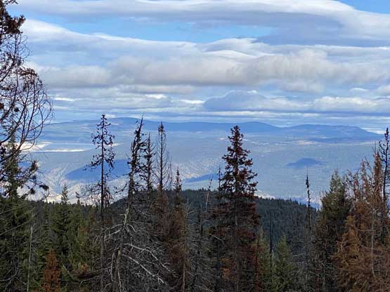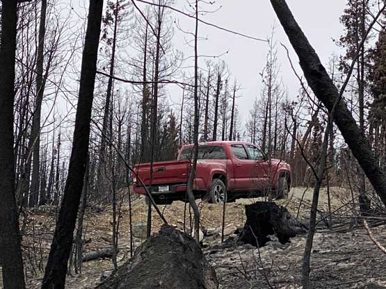 From where we parked for “Pasulko Peak” we drove to around 1800 m elevation and then gradually descended into a deep valley at 1250 m elevation. This was the “prominence saddle” of Arthur Seat. The forest suddenly transitioned into the burnt mess but the road was still in a good shape. We drove about 100 m up the far side of the saddle and parked at a convenient spot at a switch-back. This FSR extends about 20 km out of Laluwissen-Botanie area is a one-direction system meaning we must reverse the entire drive on the way back home. There’s no road to connect the upper slopes of Arthur Seat down into Murray Creek or the main Thompson River gorge at Spences Bridge.