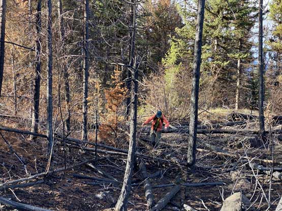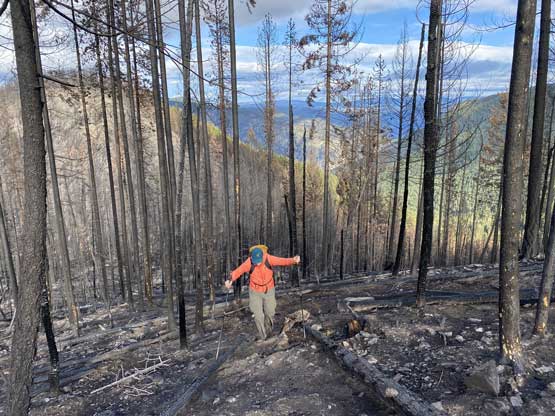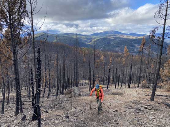 After taking a few victory shots we immediately started the descent. I led the way back sticking as close to our own GPS tracks as possible. We managed to avoid that small section of the un-burnt forest by staying farther to the south and this way we stayed entirely on the burnt forest on the return hike.